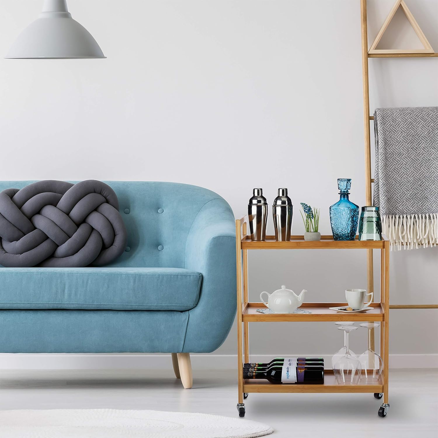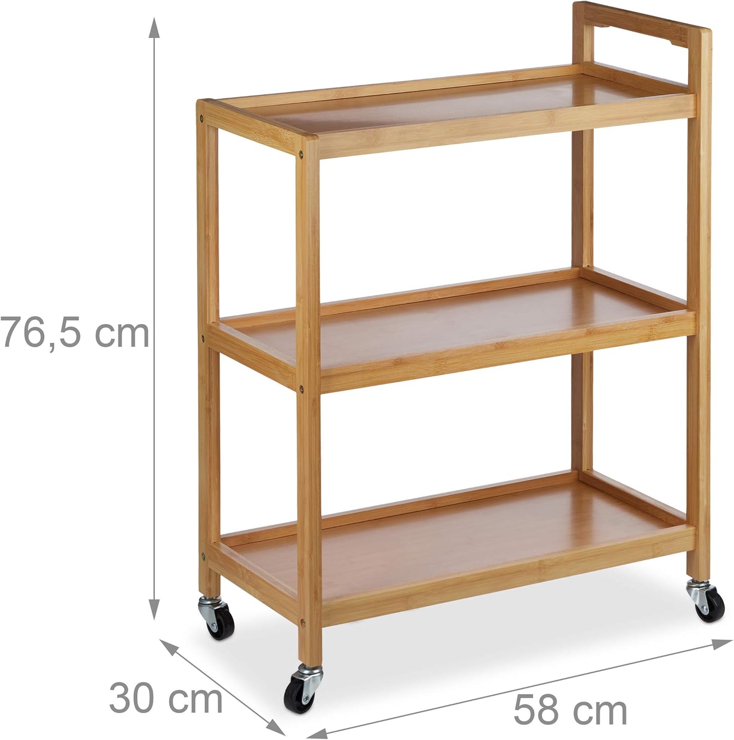 Relaxdays Servierwagen Bambus, 3 Ablagen, natürliche Optik, 360° drehbare Rollen, Rollwagen, HxBxT: