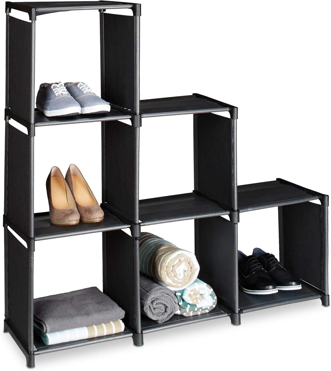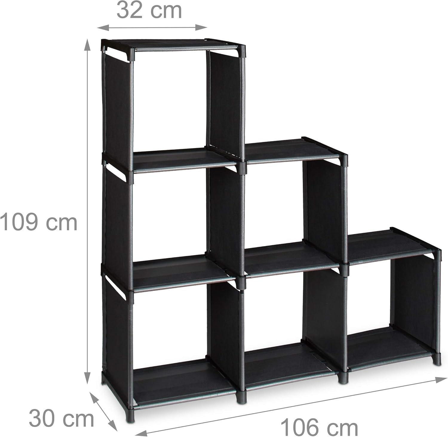 - Stauraum - Stufenregal mit 6 Fächern in unterschiedlichen Farben - Jedes Fach hat eine quadratische Grösse von 32 cm- H x B x T: ca. 109 x 106 x 30 cm - Platz für Bücher, CDs, Kleidungsstücke uvm.