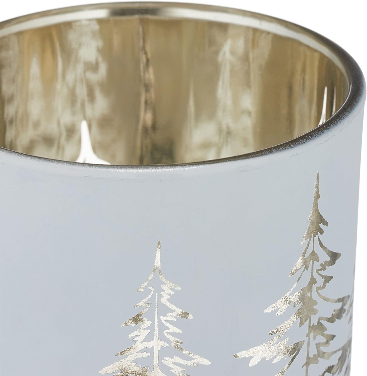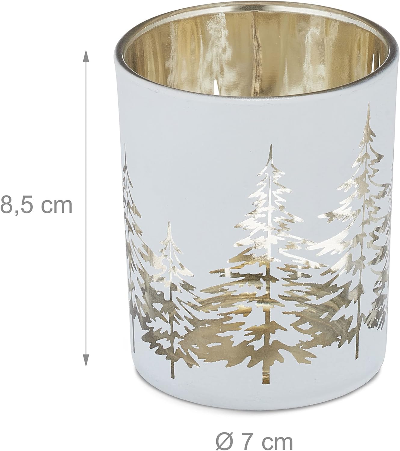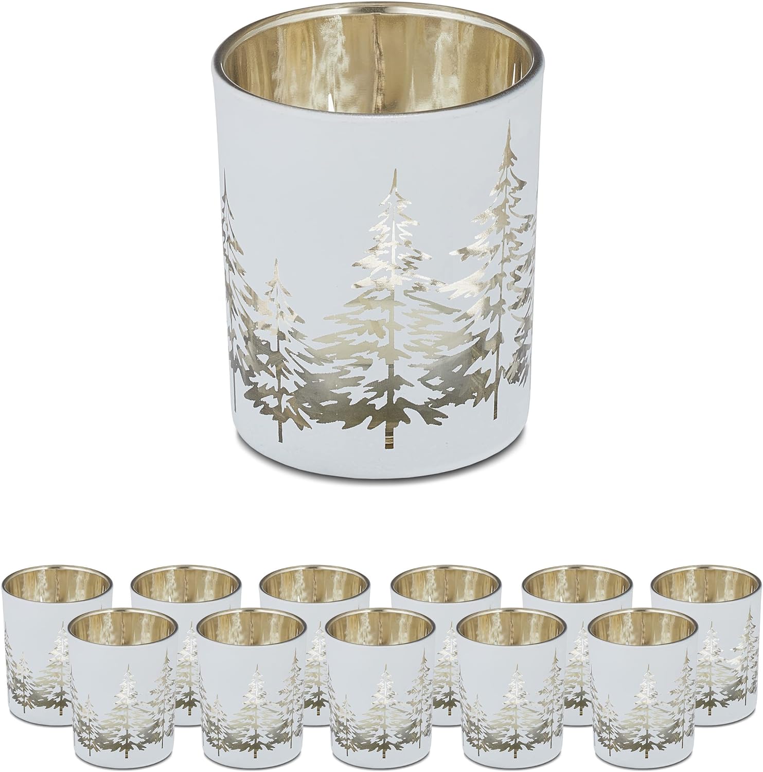 - Set: 12 runde Teelichtgläser aus Glas mit weiss-goldenem Wald-Motiv - Für wohlige Winterabende daheim