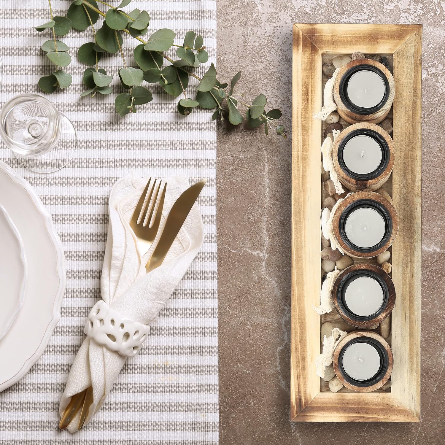 - Wohnaccessoire: Stilvolles Teelichthalterset mit 5 Teelichtständern, Kerzentablett und Dekosteinen