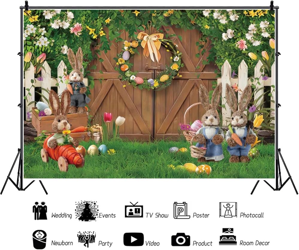 Renaiss 3x2m Frühling Ostern Hintergrund für Fotografie Holz Tür Gras Blumen Ostereier Hase Hintergr