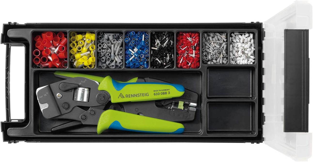 - Hülsensortiment: 150 x 0,5 mm²; 150 x 0,75 mm²; 100x 1,0 mm²; 100x 1,5 mm²; 100x 2,5 mm²; 100x 4,0 mm², 50x 6,0 mm², 50x 10,0 mm²