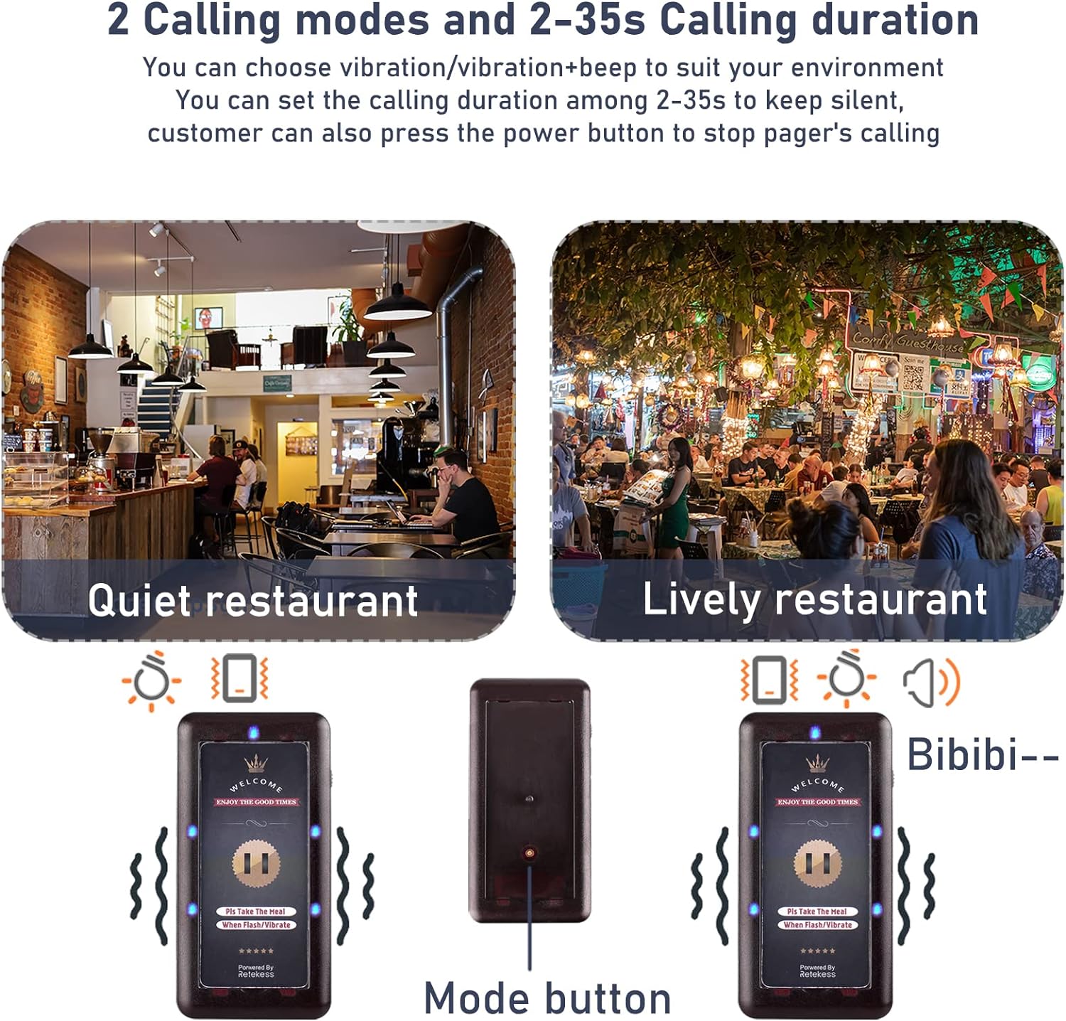 - 2 Eingabeaufforderungsmodi; Vibration + Blitz; Vibration + Piepton + Blitz; und die Eingabeaufforderung ist einstellba; geeignet für alle Arten von Szenen nach Ihren Bedürfnissen; Restaurant; Hotel; Golfclub; Bistro; Biergarten; Tierklinik; etc