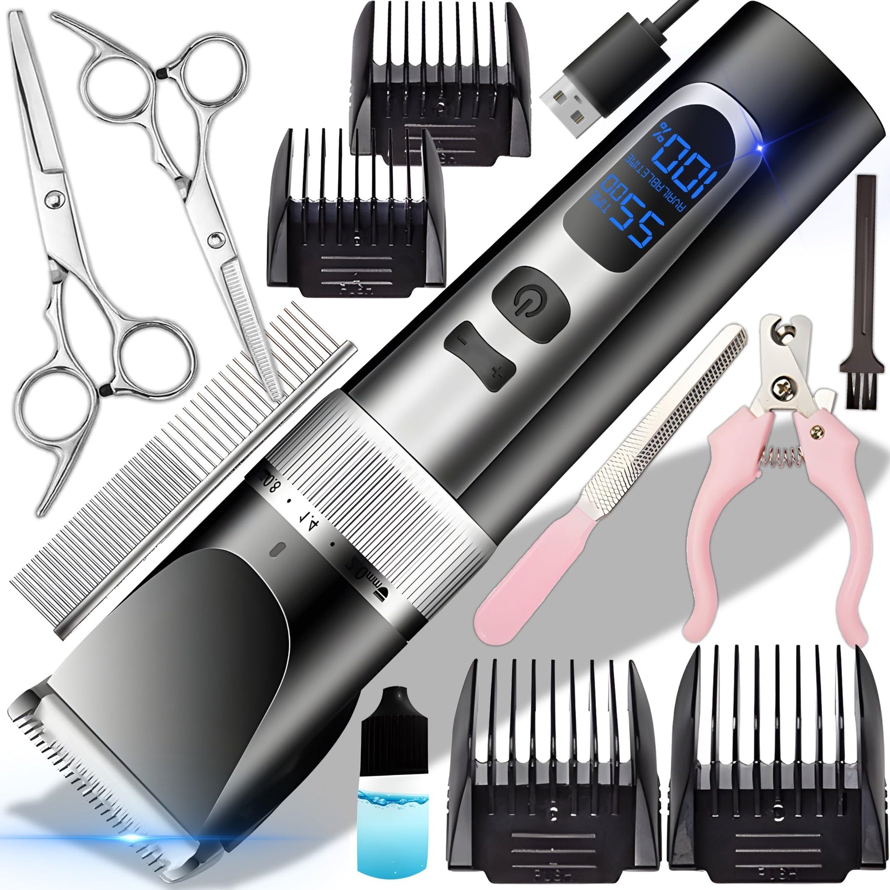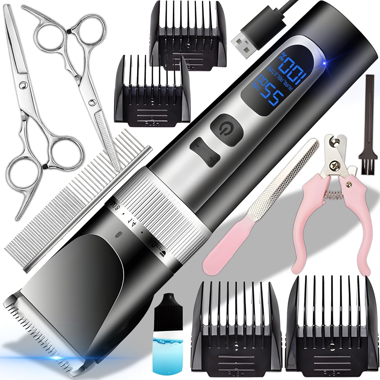 - Umfangreiches Kit- Das Kit enthält zusätzliche Ausrüstung, die Ihnen bei der richtigen Pflege Ihres Haustieres helfen wird. Dieses umfangreiche Set enthält einen Kamm, 2 Scheren, eine Haarschneidemaschine und eine Feile. Mit dem Kamm können Sie das