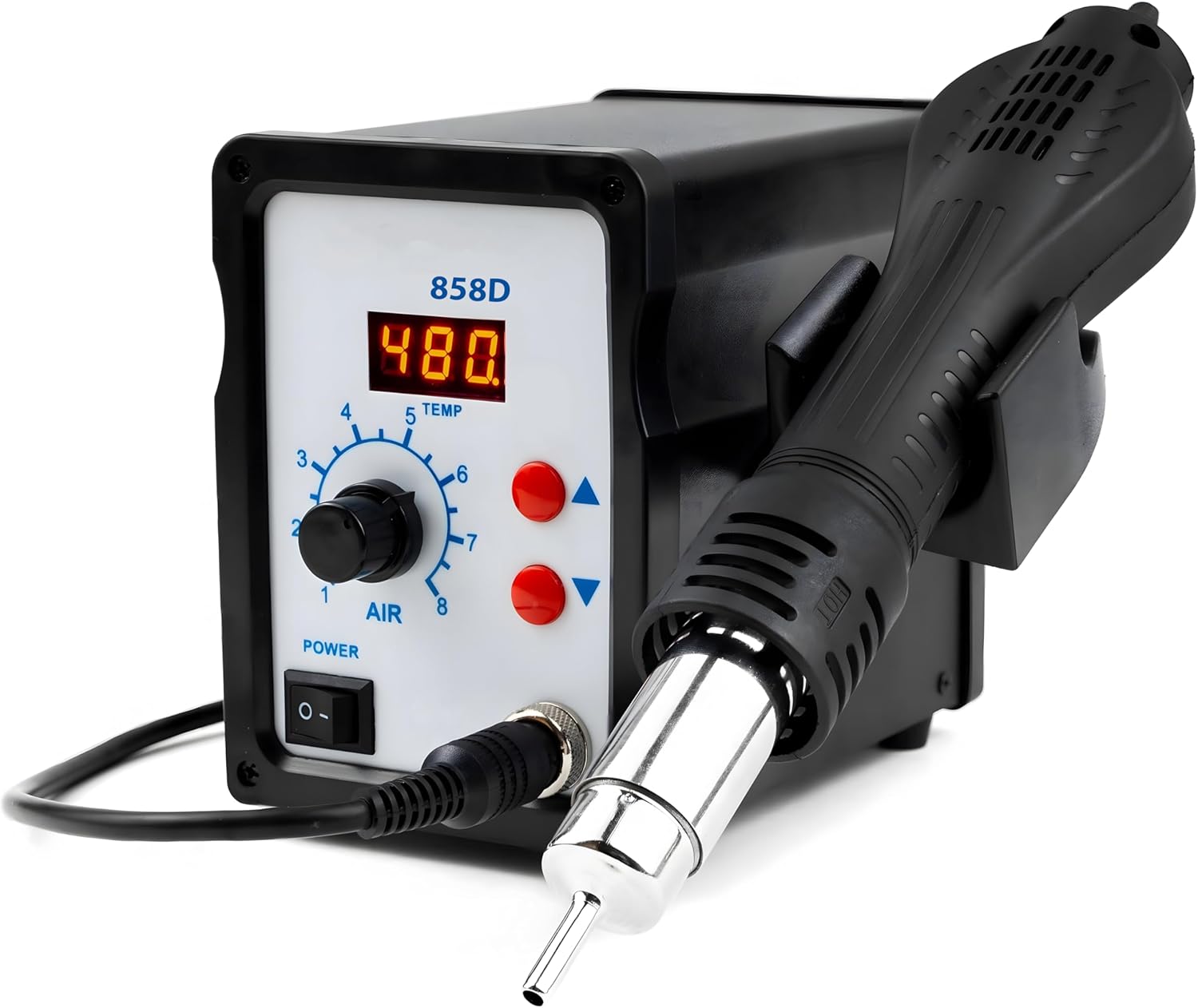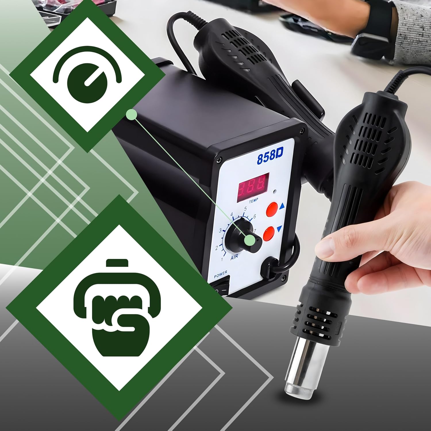- Stufenlose Luftstromregelung – Die 858D II ermöglicht eine stufenlose Regelung des Luftstroms bis zu 120 l/min, was präzises Löten und Entlöten von Bauteilen ermöglicht. So können Sie das Werkzeug an jede Aufgabe anpassen und behalten die
