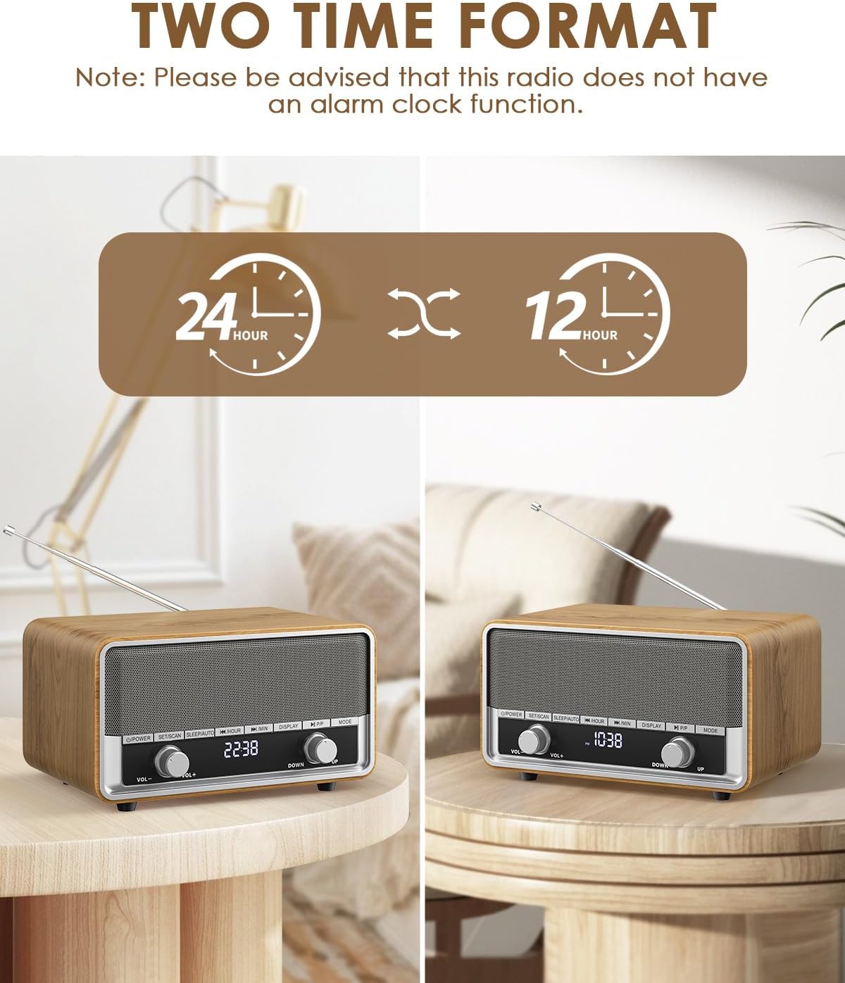 - Retro-Holzmaserungs-Radio: Das Bluetooth-Radio ist leicht und raffiniert, perfekt für kompakte Küchen, gemütliche Schlafzimmer und formelle Büros. Seine Retro-Holzmaserung verleiht ihm nicht nur eine klassische Ästhetik, sondern sorgt auch dafür,