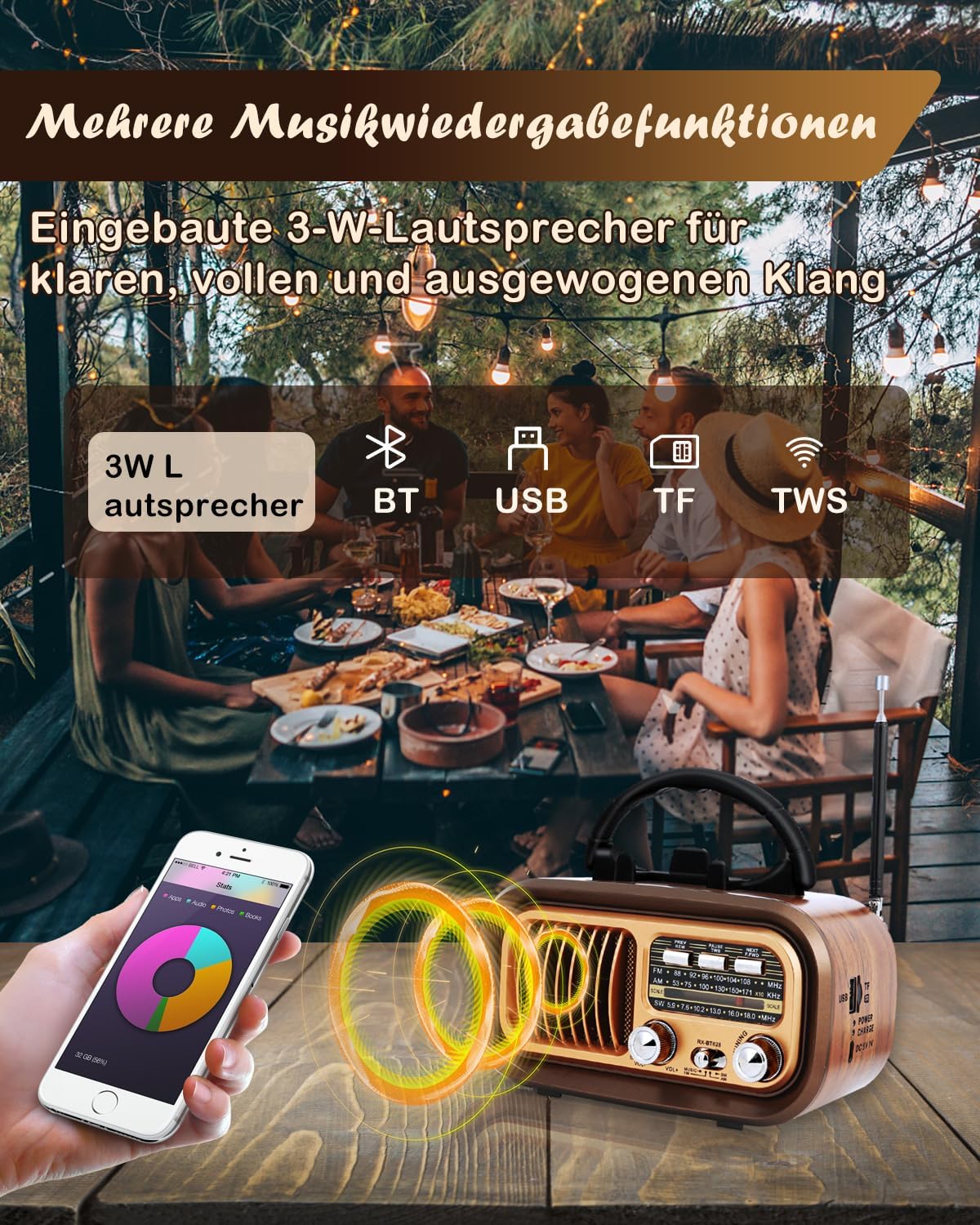 - Multifunktionale Musikwiedergabe: Dieses nostalgie radio retro mit Bluetooth 5.0-Technologie ermöglicht Ihnen die Wiedergabe von Musik von Ihrem Mobiltelefon über das Radio. Legen Sie eine TF-Karte/USB-Flash-Laufwerk, um heruntergeladene lokale Musik