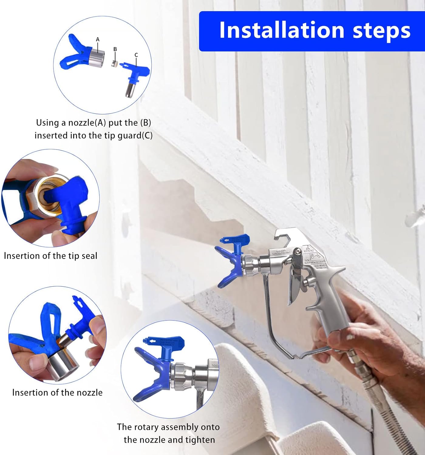 - Einfach zu installieren: Setzen Sie den Dichtungsring und die Airless-Lackierpistole in der Reihenfolge in den Airless-Spritzschutz ein, dann drehen und fixieren.