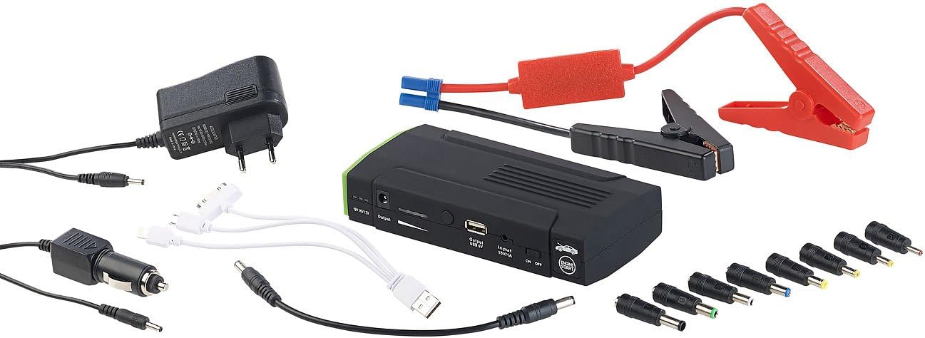 • Powerbank inklusive Überbrückungskabel mit Pol-Klemmen, 230-Volt-Netzteil, 12/24-Volt-Netzteil, Notebook-Kabel (15 cm), 8 Notebook-Adapter, Universal-USB-Kabel, Aufbewahrungstasche und deutscher Anleitung. Akku Starthilfe Powerbank - Ausserdem relevant