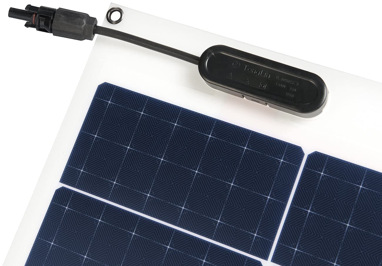 - Zum Anschluss an Laderegler oder eine 12-Volt-Batterie (bitte dazu bestellen) • Leerlaufspannung (Voc): 24,31 Volt • Maximale Systemspannung: 1.000 Volt DC • Salzwasserfest: auch zum Einsatz in der Marine geeignet