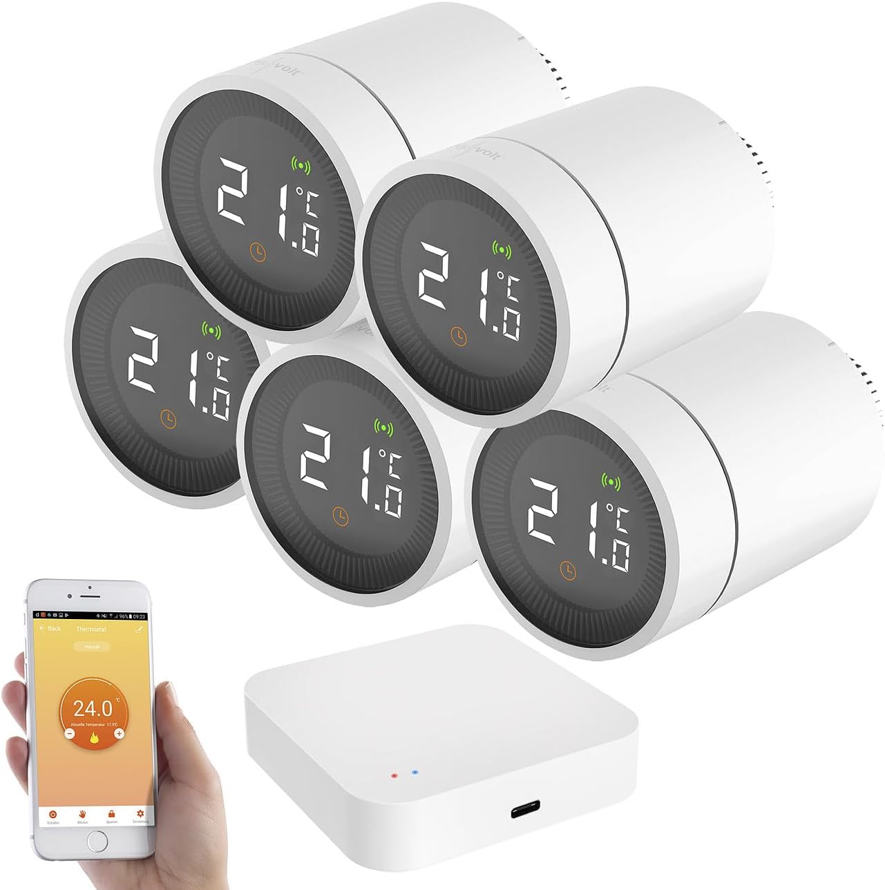 - Kompatibel mit Amazon Alexa und Google Assistant: Heizungsthermostat per Echo, Echo Dot, Google Home und kompatiblen Lautsprechern steuern • 5 Heizkörperthermostate jeweils inklusive Feststellring, Adapter, WLAN-Gateway RC-350.duo, USB-Stromkabel und