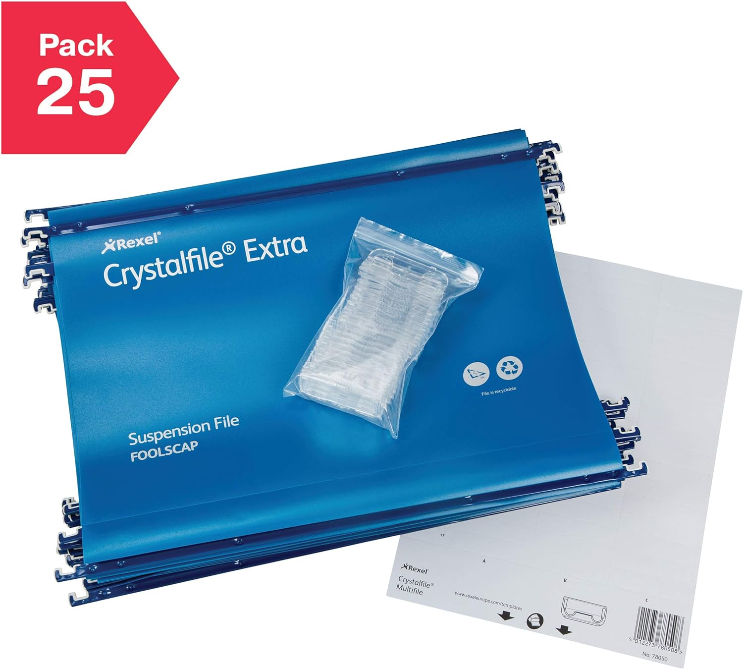 - Inhalt: 1 x Packung mit 25 Rexel Foolsc. ap Crystalfile Extra Hängemappen 30 mm aus Polypropylen, blau, 70633, Masse (BxHxT): 407x240x30 mm, zum Einhängen auf Schienen im Abstand von 387 mm