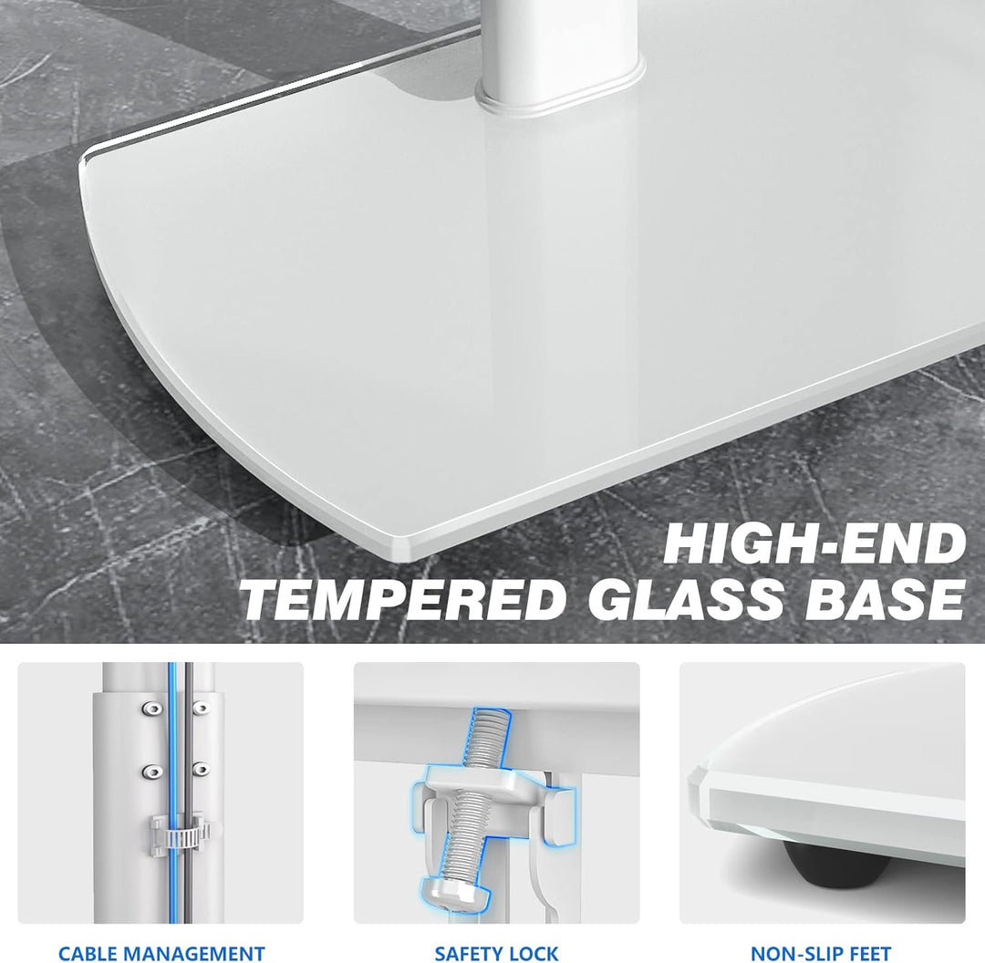 - Solider Ständer:Der TV Bodenständer besteht aus stabilen Stahlhalterungen und einer sicheren 8mm gehärteten Glasbasis mit selbstklebenden Gummifüssen für ein grossartiges Aussehen und eine schwere Last, es ist sicher und stabil, um die hintere