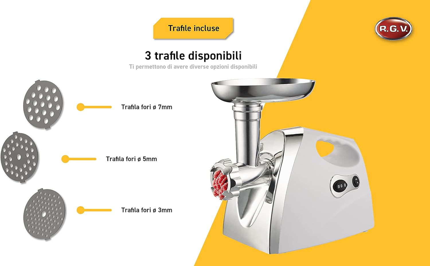 - 3 MASCHINEN IN 1: FLEISCHWOLF - GERÜSE - REIBE: Dank des mitgelieferten Zubehörs können Sie zusätzliche Lebensmittel wie Käse und Tomaten zur Zubereitung von Pürees, Obst für die Zubereitung von Konserven, Marmeladen und Fruchtgelees zerkleinern