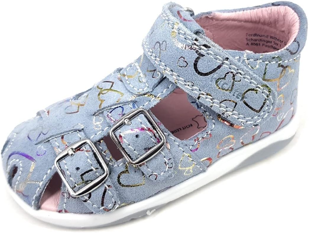PRODUKTBESCHREIBUNGEN Kleinkindersandale aus Veloursleder mit Klettverschluss und Herzchenprint. Das hochwertige, weiche Lederfutter sorgt für ein angenehmes Fussklima. Durch die individuell einstellbaren Klettverschlüsse und Schnallen kann der Schuh optimal an den Fuss angepasst werden. Der Klettverschluss ermöglicht ein einfaches und selbstständiges An- und Ausziehen. Die patentierte und flexible Roll-Off® Sohle unterstützt das natürliche Wachstum der Füsse.