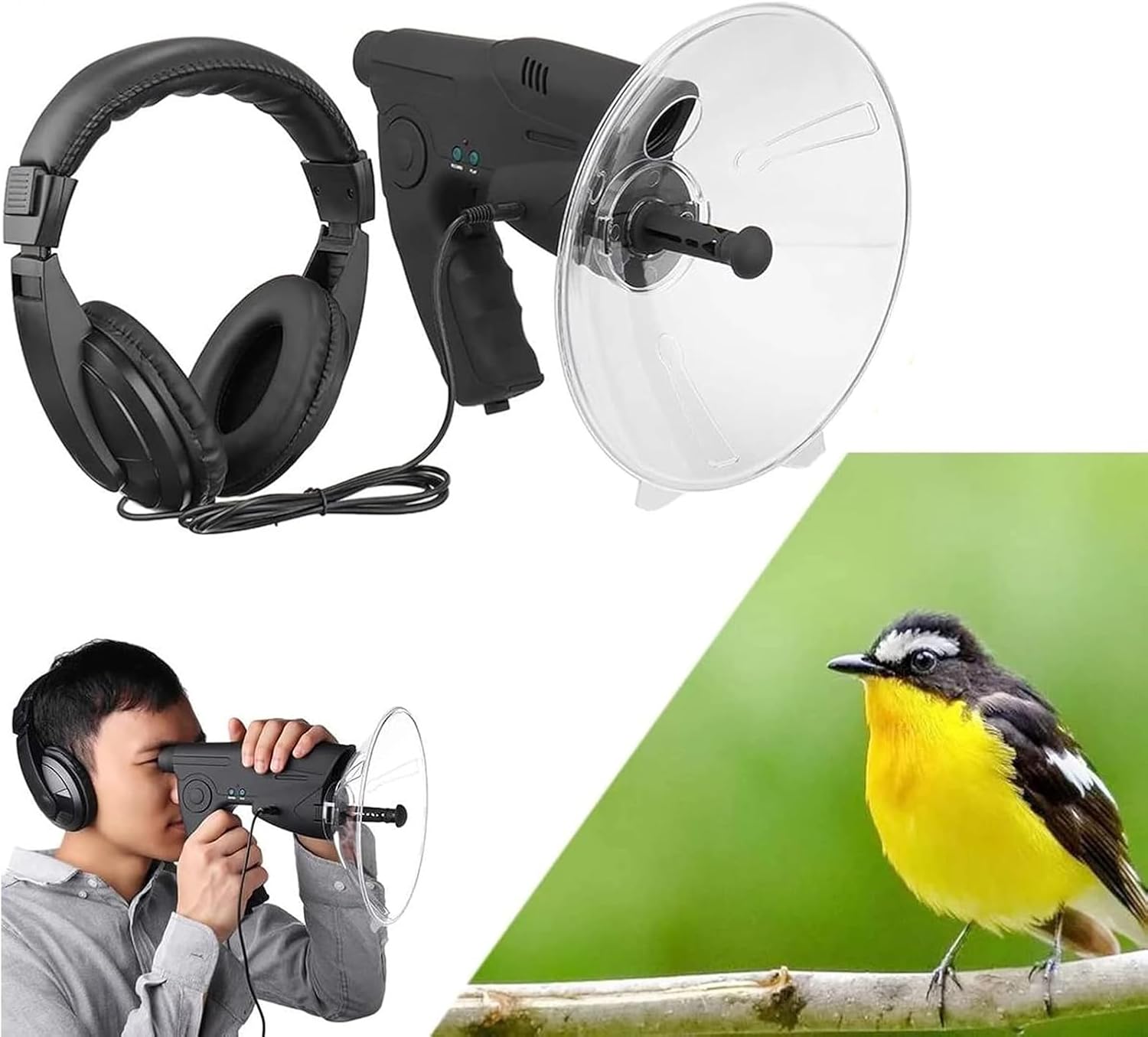 - 🐦Mit Kopfhörer: Das Richtmikrofon Abhörgerät wird mit einem Kopfhörer geliefert, der Ihnen ein immersives Hörerlebnis bietet. Sie können die aufgenommenen Klänge in hoher Qualität und ohne störende Umgebungsgeräusche geniessen