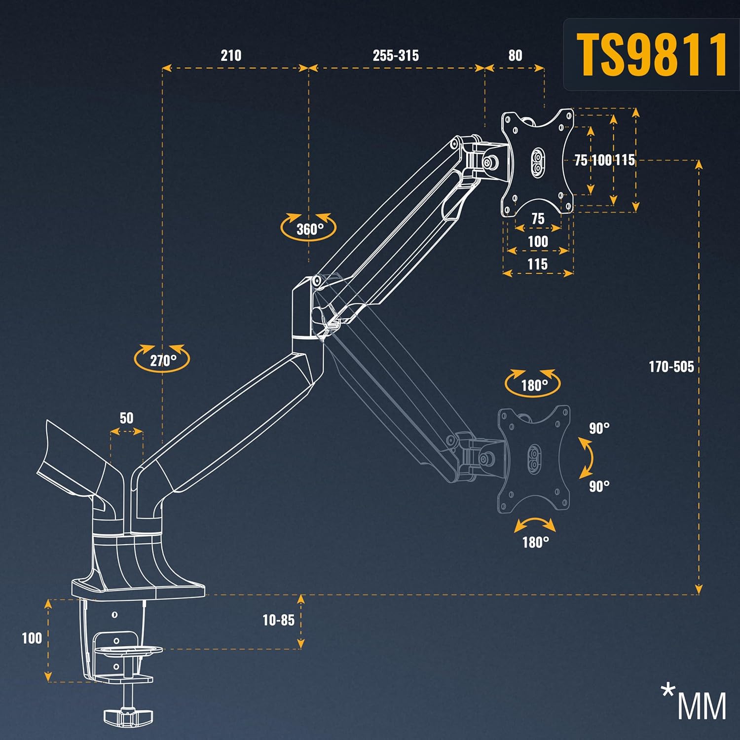 RICOO Monitor Halterung Tisch Gasdruckfeder für 15-27 Zoll, VESA Tischhalterung, Monitorarm TS9811,