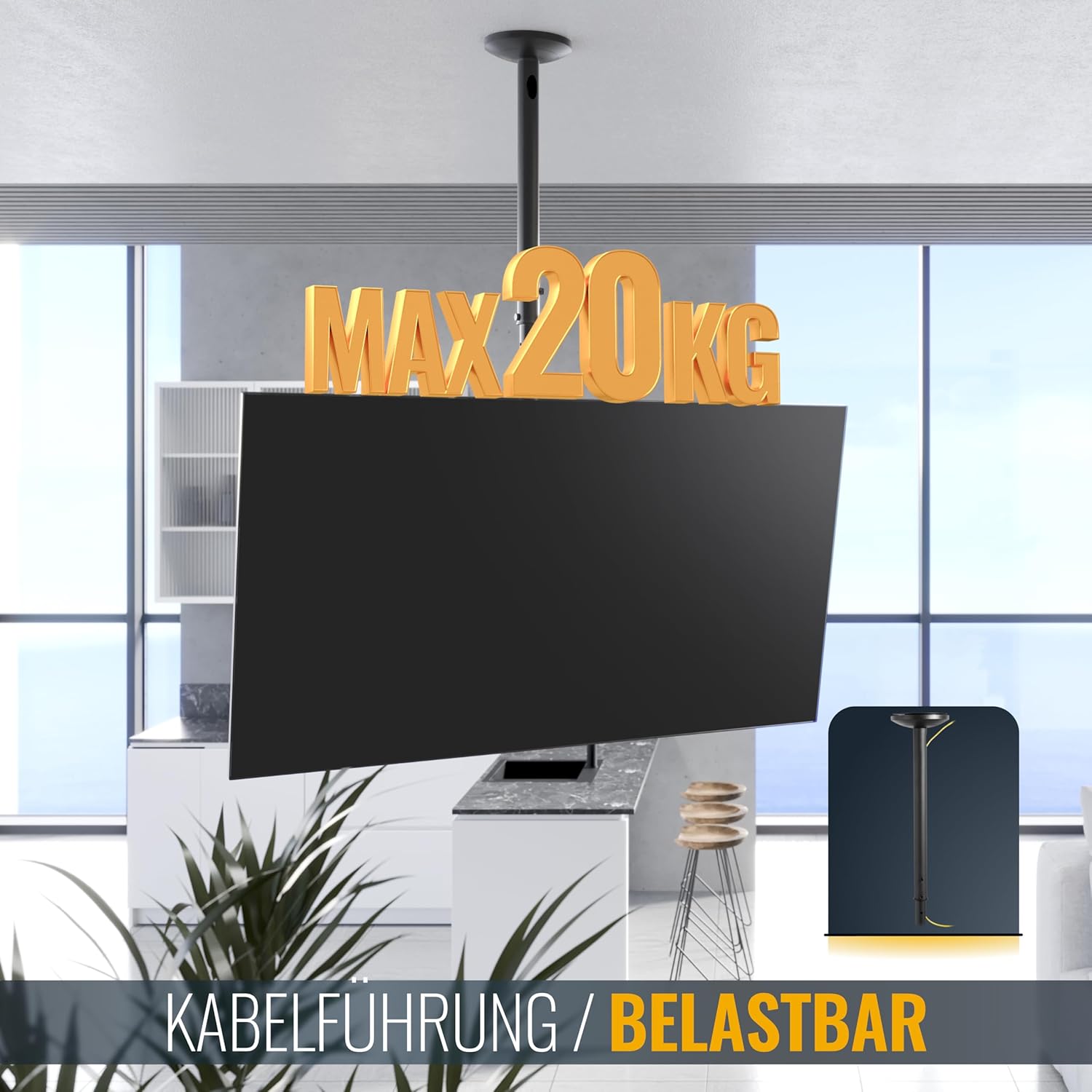 - 𝗙𝗨𝗡𝗞𝗧𝗜𝗢𝗡𝗘𝗡: Dieser Fernsehhalter ist flexibel +/-90 Grad schwenkbar. Neigbar um +/-20. Montage an Decke / Deckenbefestigung. Deckenabstand 608mm - 858mm.