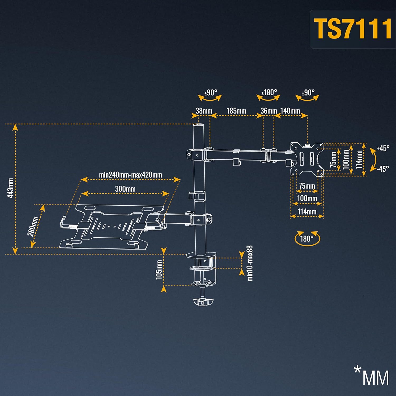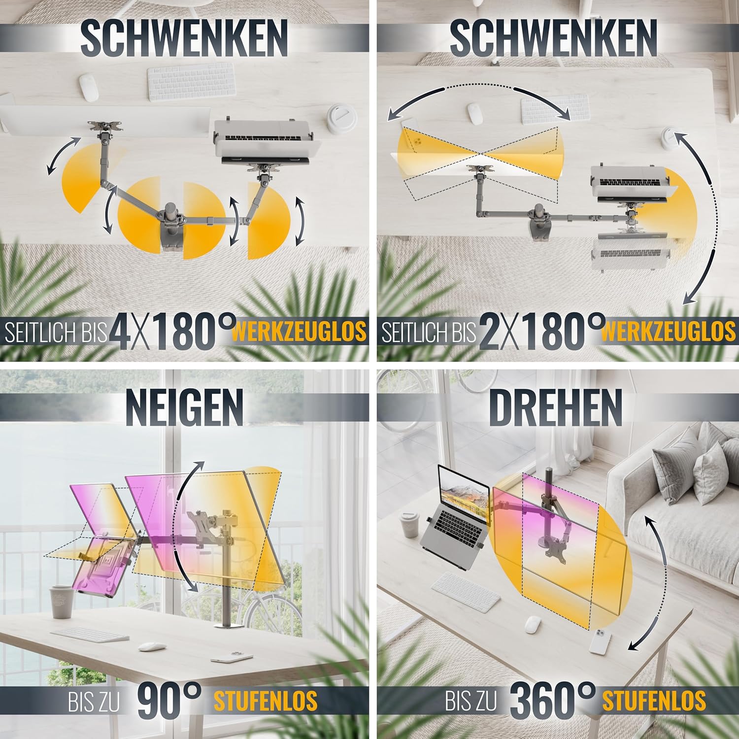 - 𝗞𝗔𝗣𝗔𝗭𝗜𝗧Ä𝗧: Belastbarkeit der Monitorhalterung beträgt max 8Kg (Laptop-Aufnahme max 4kg). Montage per Tischklemme an der Tischkante. Der Standfuss ist auch für curved Flatscreens geeignet