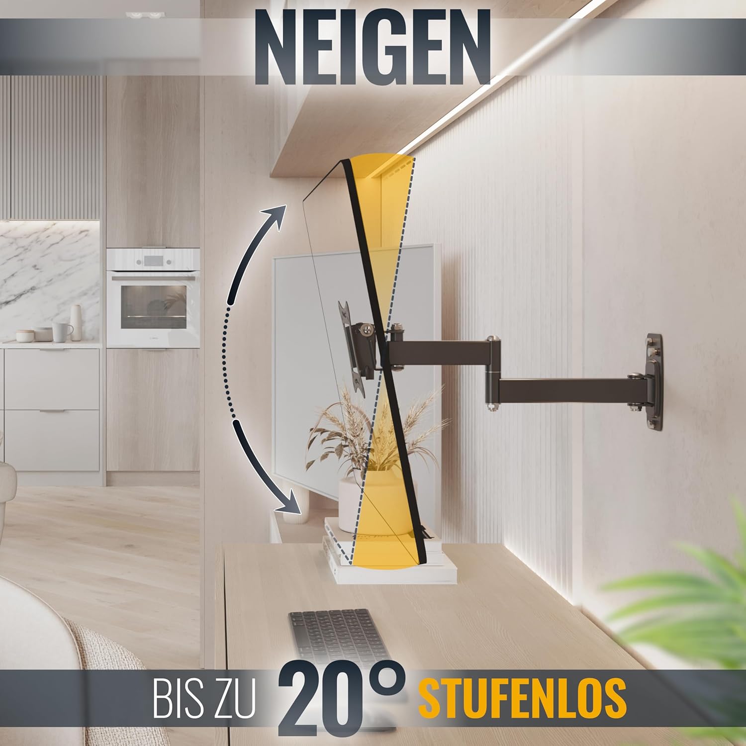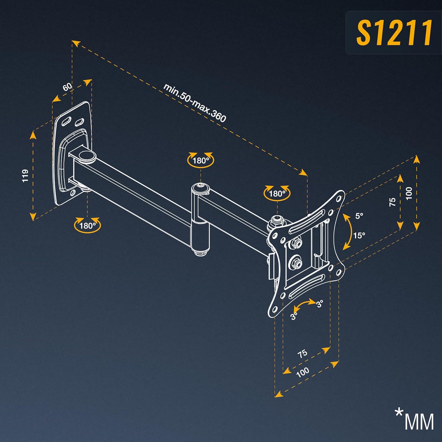 - FUNKTIONEN: Diese Monitor Halterung ist bis 180 Grad schwenkbar wenn Bildschirm Breite max 64cm. Monitor Arm Neigebereich +15/-5 Grad. Der Wandabstand vom Wandhalter flexibel verstellbar 50mm - 360mm. Front Platte +/-3 Grad drehbar