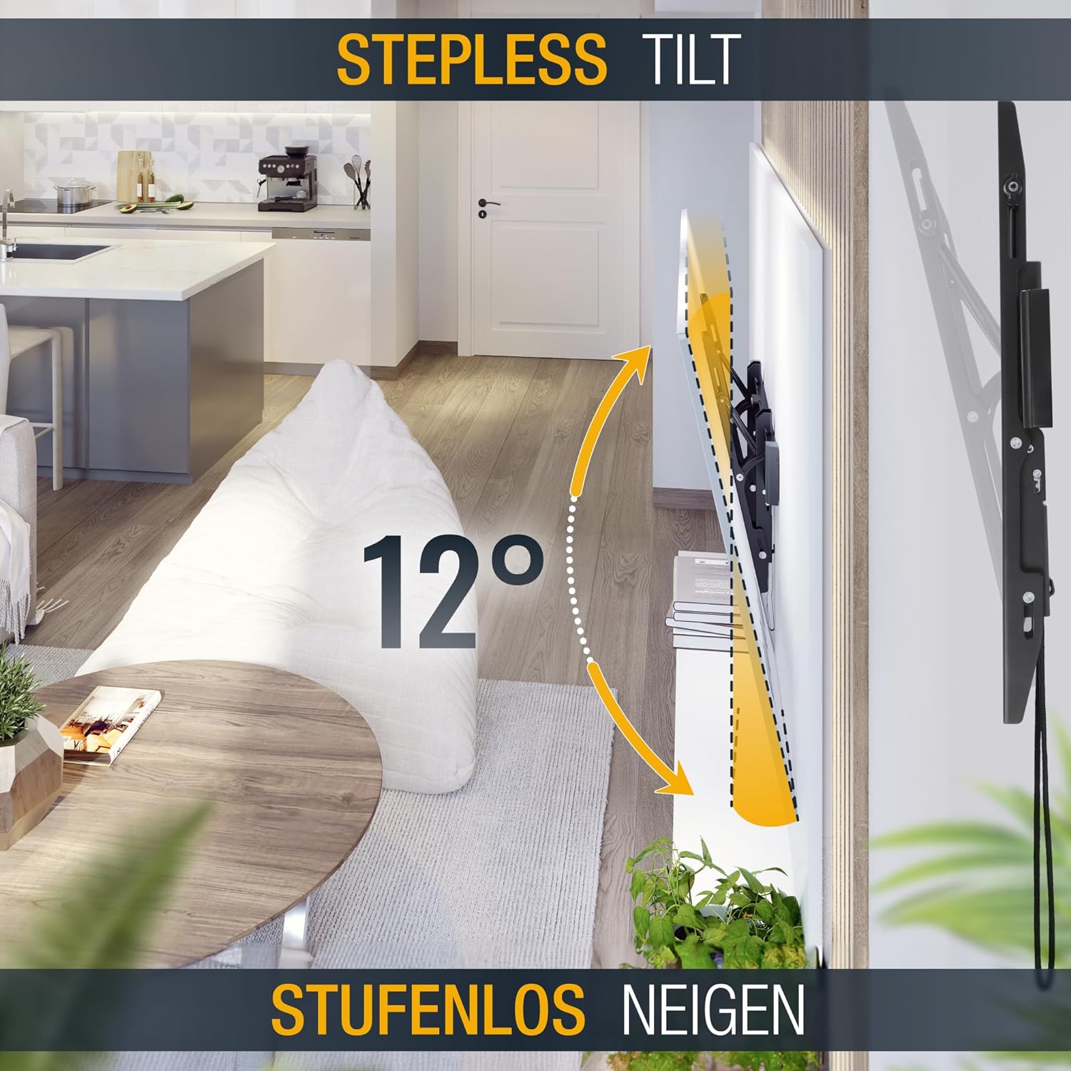 - 𝗙𝗨𝗡𝗞𝗧𝗜𝗢𝗡𝗘𝗡: Der Neigebereich der Fernseher Aufhängung ist +12/-0 Grad. Diese Fernseherhalterung ist mit einem Wandabstand von 35mm ultraslim und nah an der Wand. Dieser Wandhalter ist NICHT schwenkbar