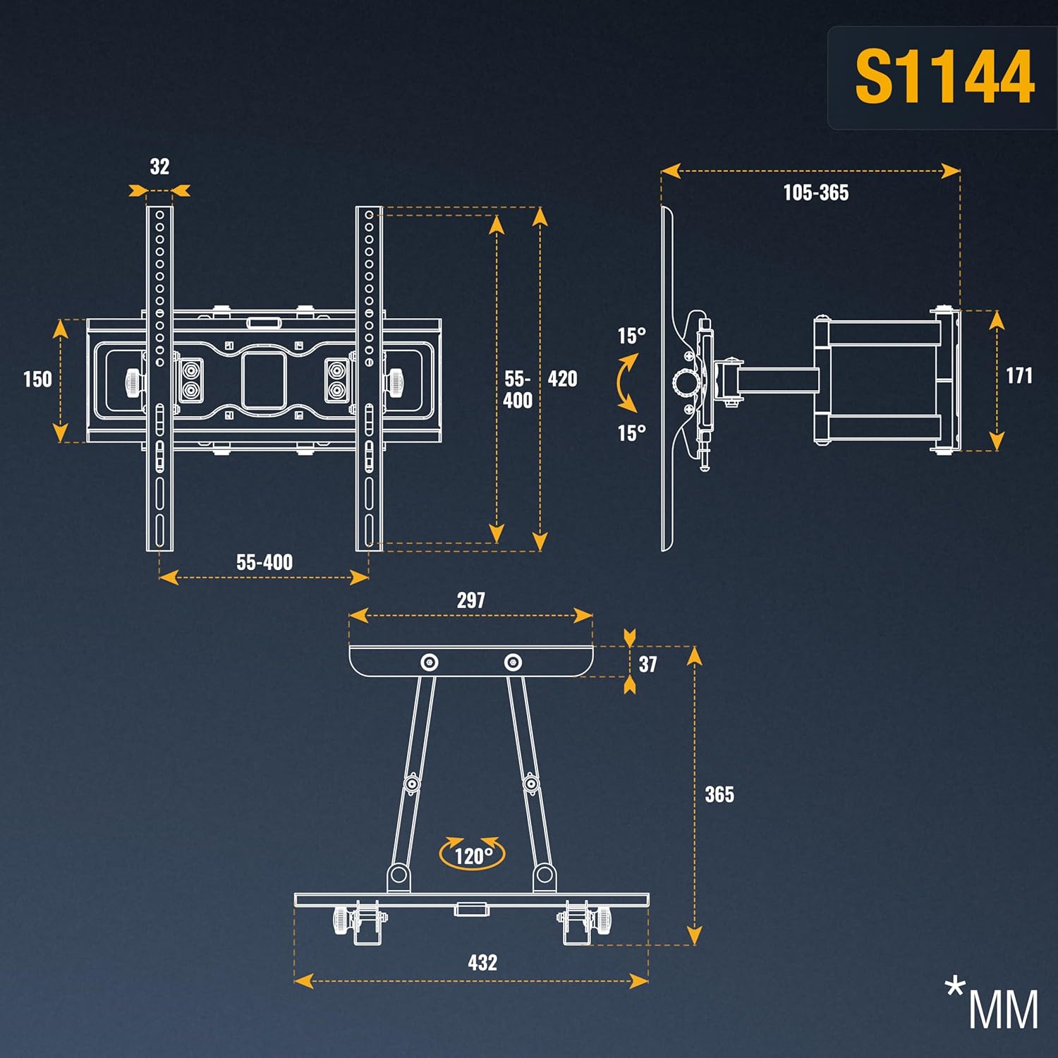 - 𝗙𝗨𝗡𝗞𝗧𝗜𝗢𝗡𝗘𝗡: Diese Fernseherhalterung ist bis 120 Grad schwenkbar wenn Bildschirmbreite max 55cm. Der Neigebereich liegt bei +/-15 Grad. Wandabstand zwischen 105mm - 365mm.