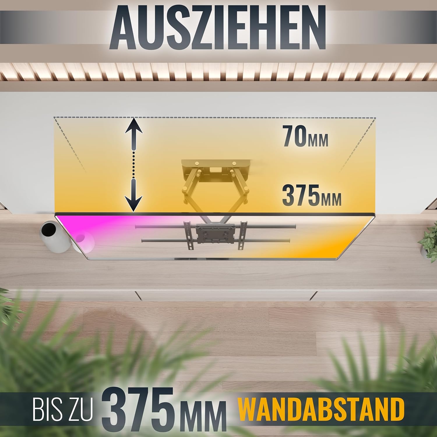 - 𝗙𝗨𝗡𝗞𝗧𝗜𝗢𝗡𝗘𝗡: Diese Fernseherhalterung ist bis 120 Grad schwenkbar je nach Bildschirmbreite. Der Neigebereich liegt bei +/-10 Grad. Wandabstand zwischen 70mm - 375mm. Zur optimalen Einstellung nach der Montage ist die