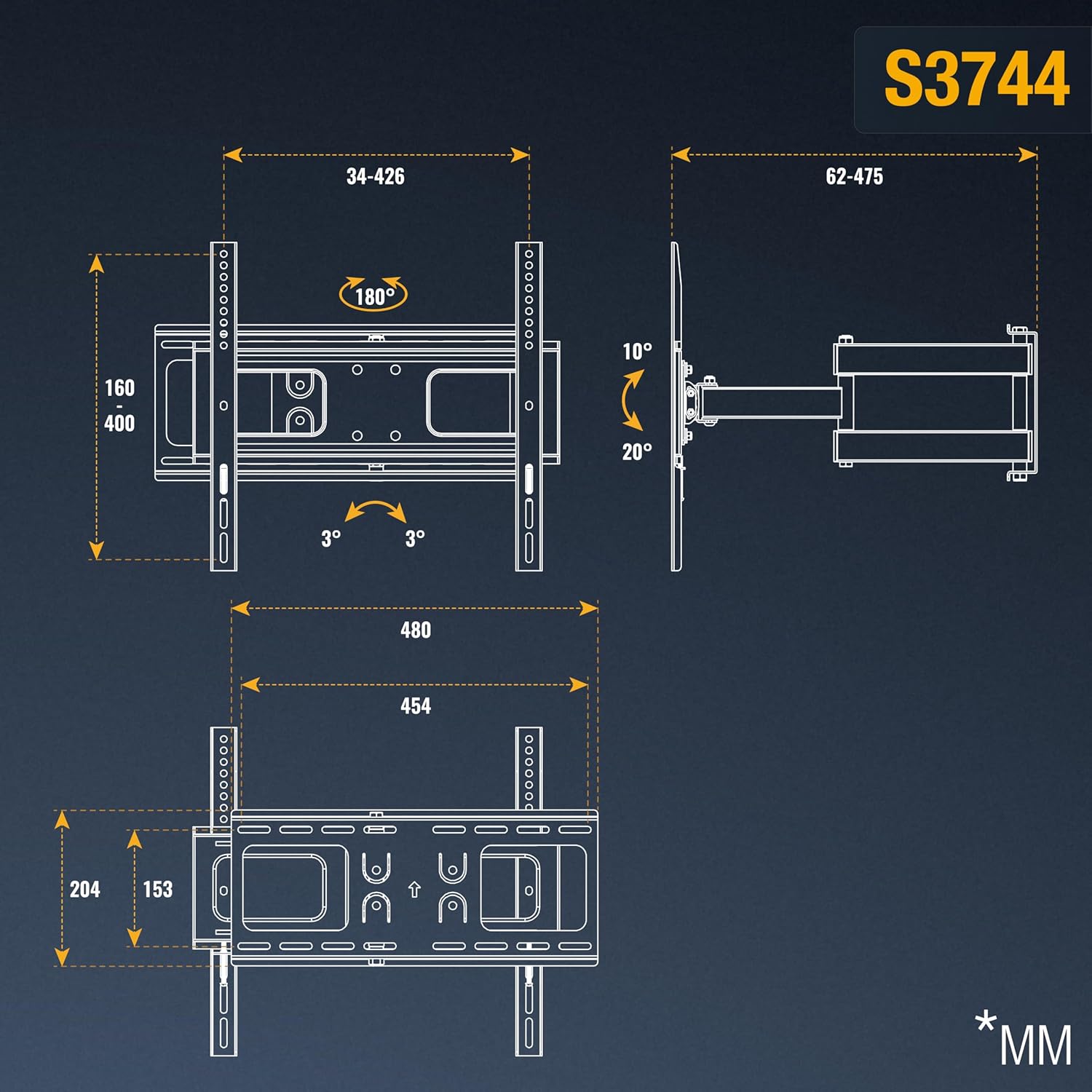 - 𝗙𝗨𝗡𝗞𝗧𝗜𝗢𝗡𝗘𝗡: Diese Fernseherhalterung ist bis 180 Grad schwenkbar wenn Bildschirmbreite max 80cm. Der Neigebereich liegt bei +20/-10 Grad. Wandabstand zwischen 62mm - 475mm. Zur optimalen Einstellung nach der Montage ist die