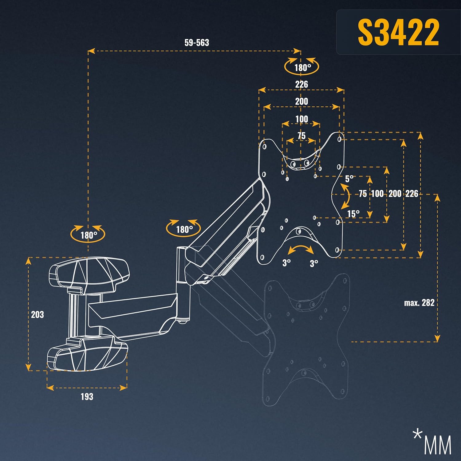 - 𝗙𝗨𝗡𝗞𝗧𝗜𝗢𝗡𝗘𝗡: Monitor Halterung 180 Grad schwenkbar je nach Bildschirmbreite. Monitor Arm Neigebereich +15/-5 Grad. Wandabstand des Wandhalter ist flexibel verstellbar von 59-563mm. Frontplatte drehbar +/-3 Grad