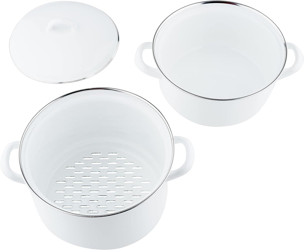 - Dreiteiliger Kartoffelkocher aus Emaille, besteht aus Topf, Topfaufsatz mit gelochtem Boden und Deckel, vier Haltegriffe aus Emaille