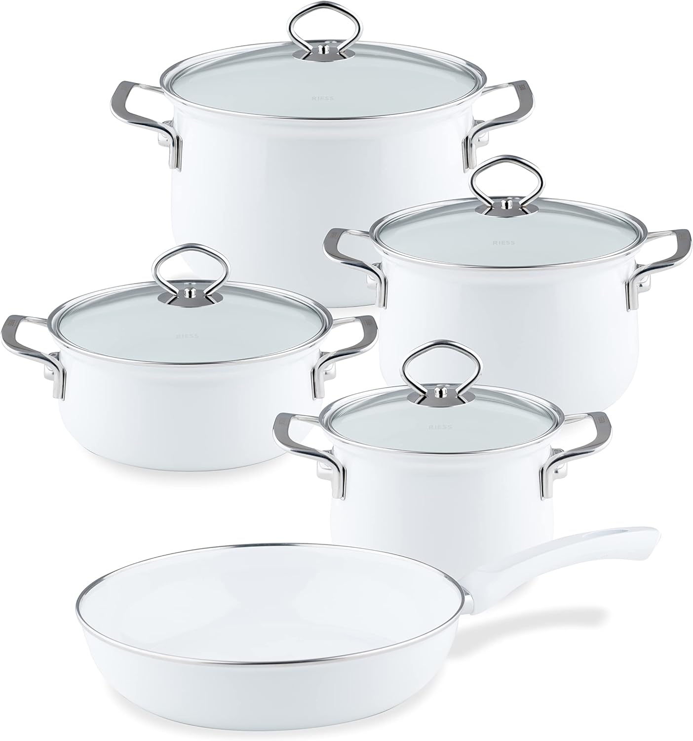 - Geschirrset aus fünf Teilen Fleischtöpfe (16, 20 und 24 cm), Kasserolle (20 cm), Bratpfanne mit Kunststoffgriff, Design-Edelstahlgriff