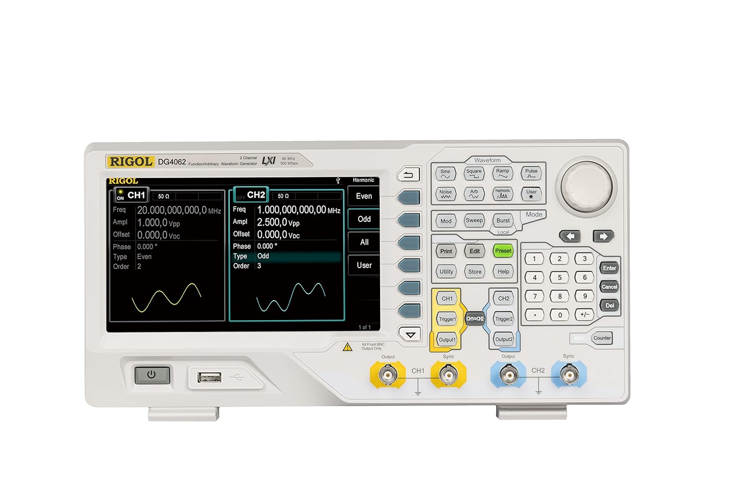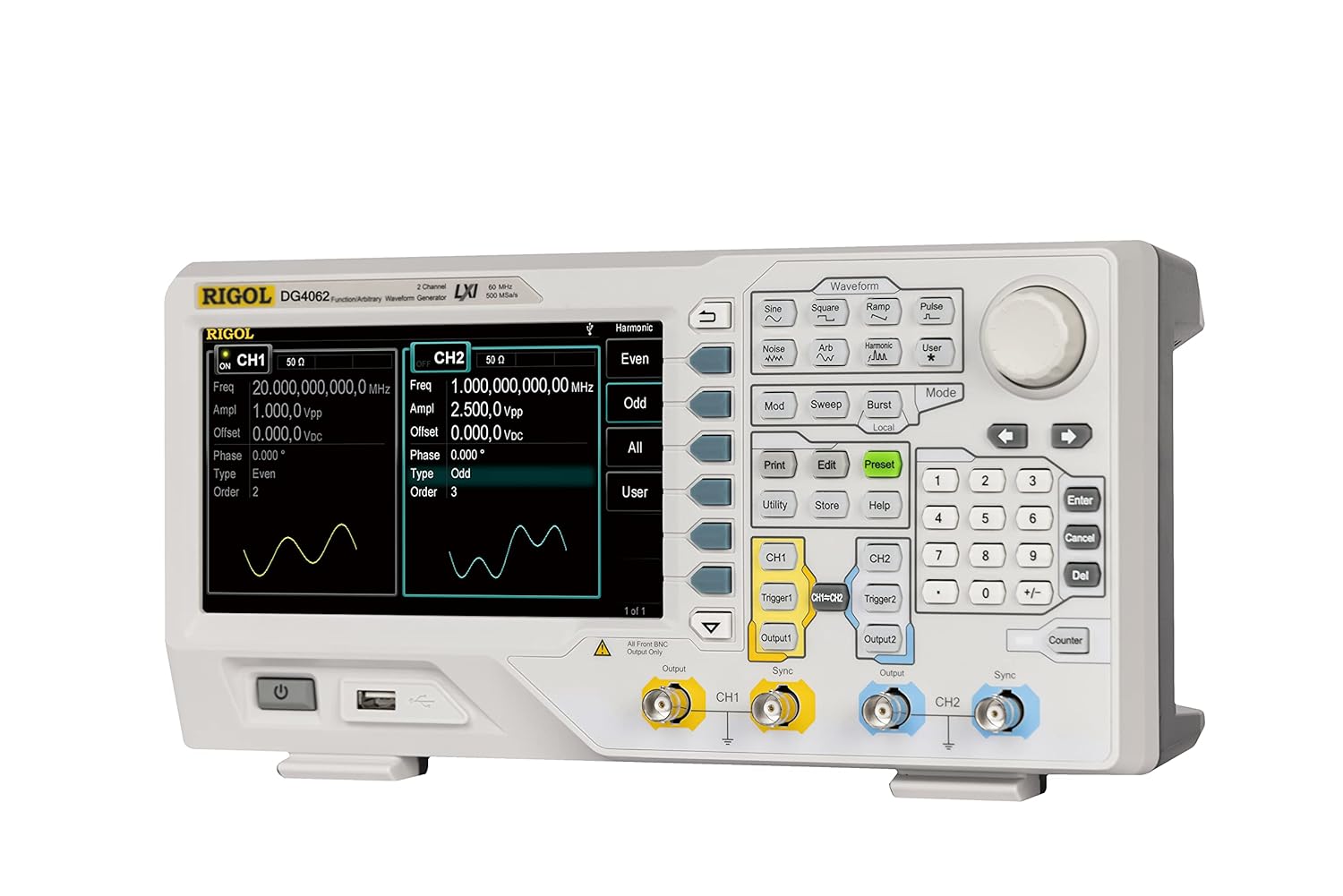 - SiFi (Signal Fidelity) für 100 % Wellenformreplikation, Eingebauter Oberschwingungsgenerator für 16 Ordnungen, Eingebauter 7-stelliger / s-Zähler bis 200 MHz, 150 Eingebaute arbiträre Wellenform, Volle Modulation unterstützt: AM, FM, PM, ASK, FSK,