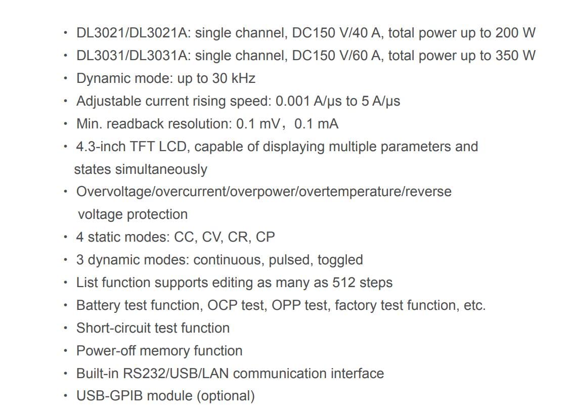 - Einkanalig, DC150 V/60 A, Gesamtleistung bis 350 W; Dynamischer Modus: bis zu 30 kHz; Einstellbare Stromanstiegsgeschwindigkeit: 0,001 A/μs bis 5 A/μs; Mindest. Rückleseauflösung: 0,1 mV / 0,1 mA