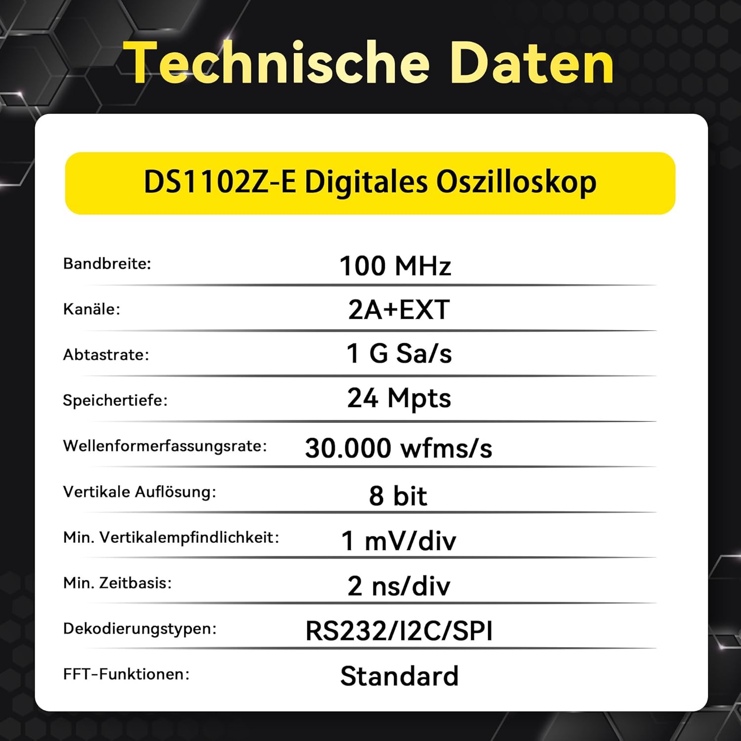 - 2 Kanäle, 100 MHz, Echtzeit-Abtastrate 1 GSa / s und bis zu 24 Mpts Speicher können das Zoomen in einen ausgewählten Teil der erfassten Wellenformen unterstützen, um mehr Details zu erhalten und innerhalb der Messpunkte zu scrollen. Verschiedene Standardtriggerungen und Busdecodierungen. Triggerungen: Windows, N-te Kante, Verzögerung, Zeitüberschreitung, Runt, RS232 / UART, I²C und SPI. Decodierung: RS232 / UART, I²C, SPI.