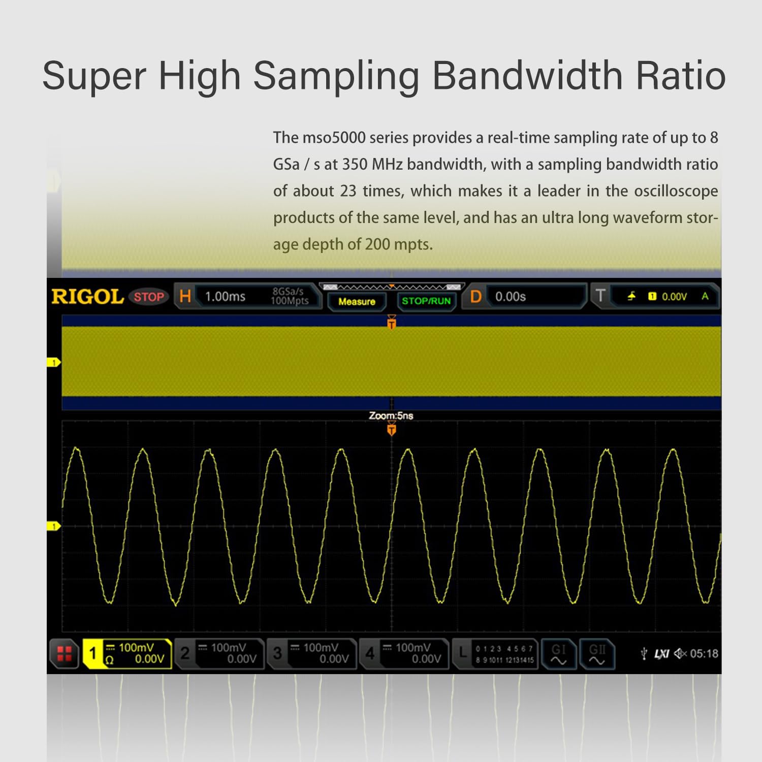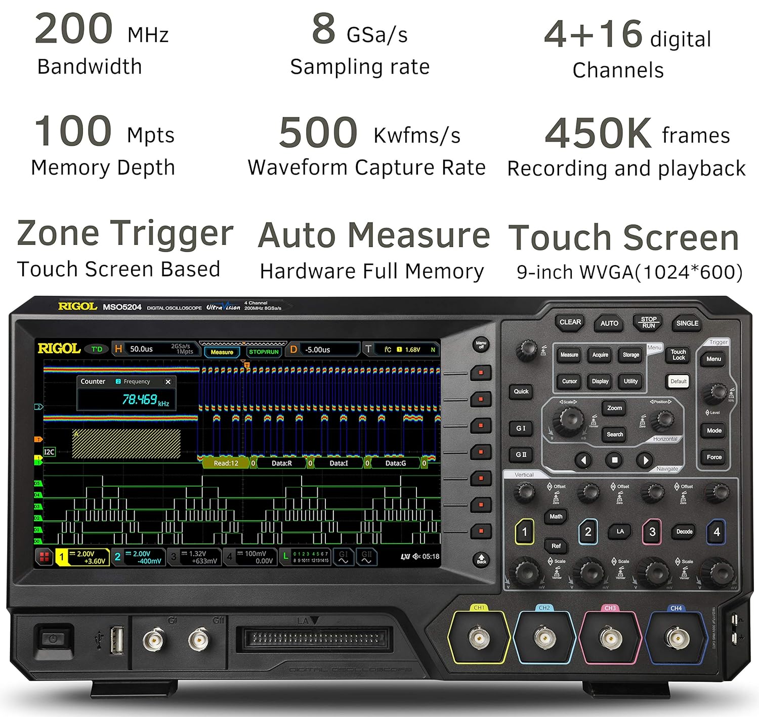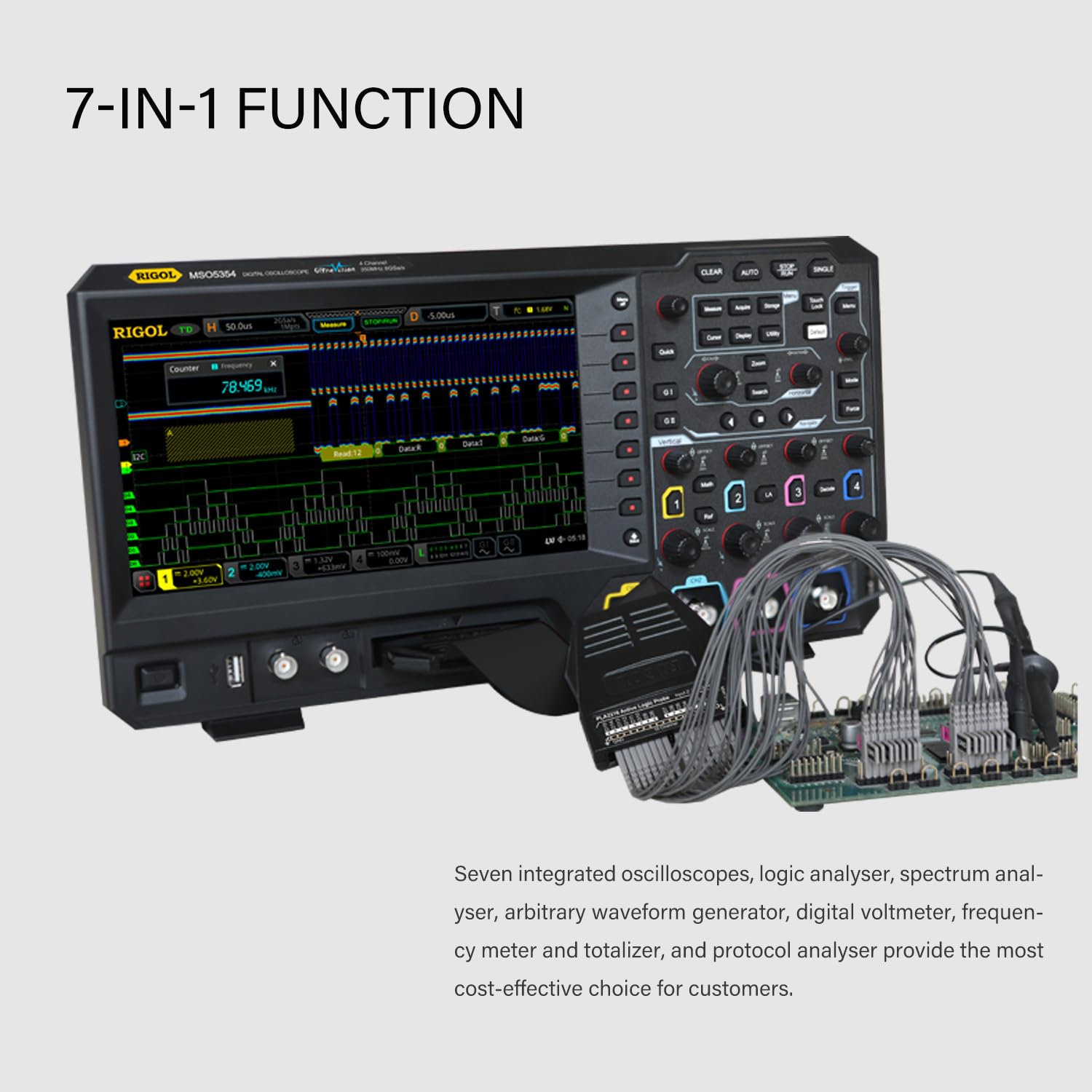 - Mehrere Schnittstellen: USB HOST & DEVICE, LAN (LXI), HDMI, Trig Out und Pass / Fail. Web Controller ist verfügbar. Zubehör: Netzkabel, USB-Kabel, Kurzanleitung und 4 Sonden. Das MSO5000-Bundle ist derzeit kostenlos und umfasst: RS232 / UART, I2C und