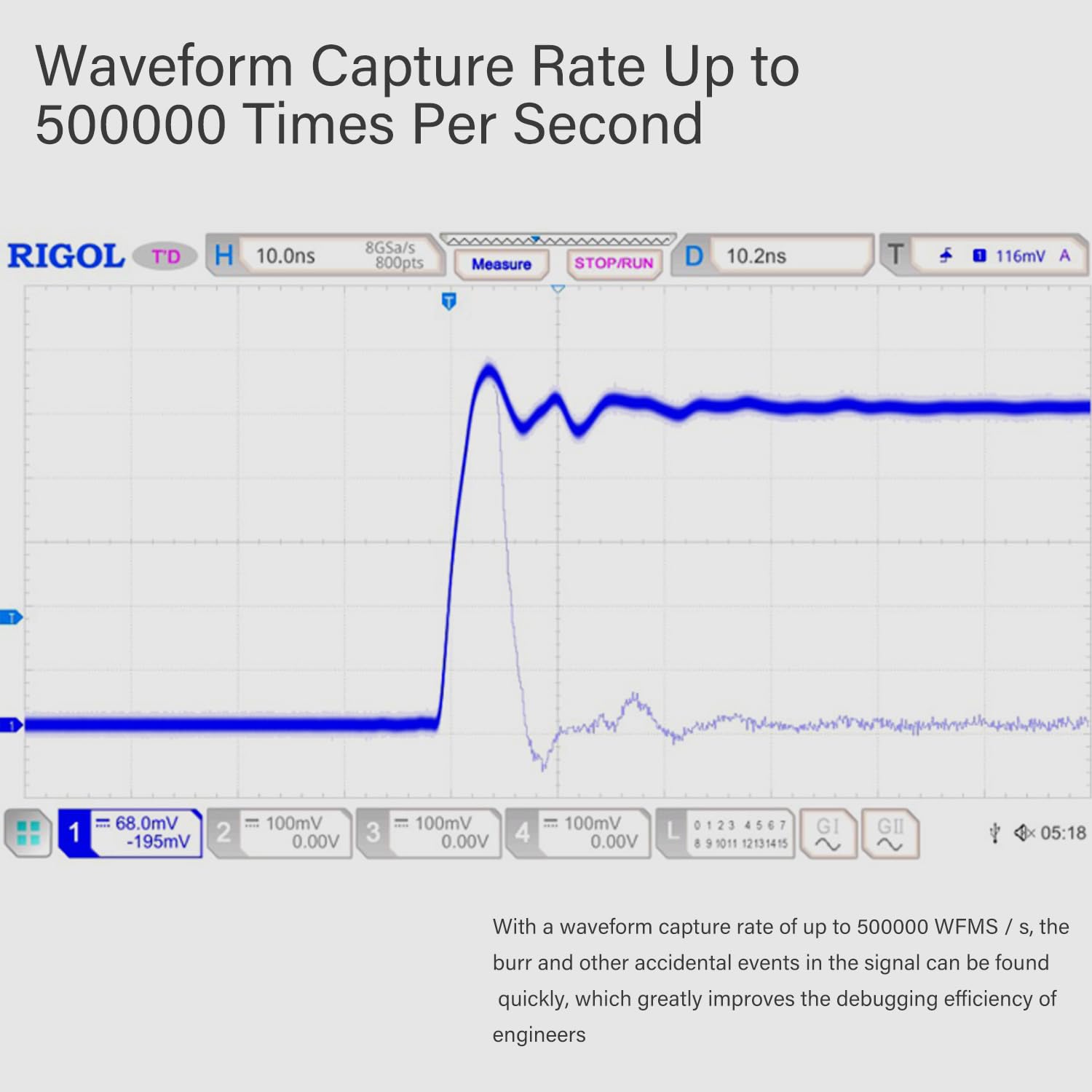 - Bis zu 500.000 wfms/s können sofortige Signale sowie abnormale Signale schneller erfassen. Es können bis zu 450.000 Harware-Wellenformaufzeichnungen angezeigt und analysiert werden. Dies hilft auch dabei, die Fähigkeit zur Erfassung von Wellenformen