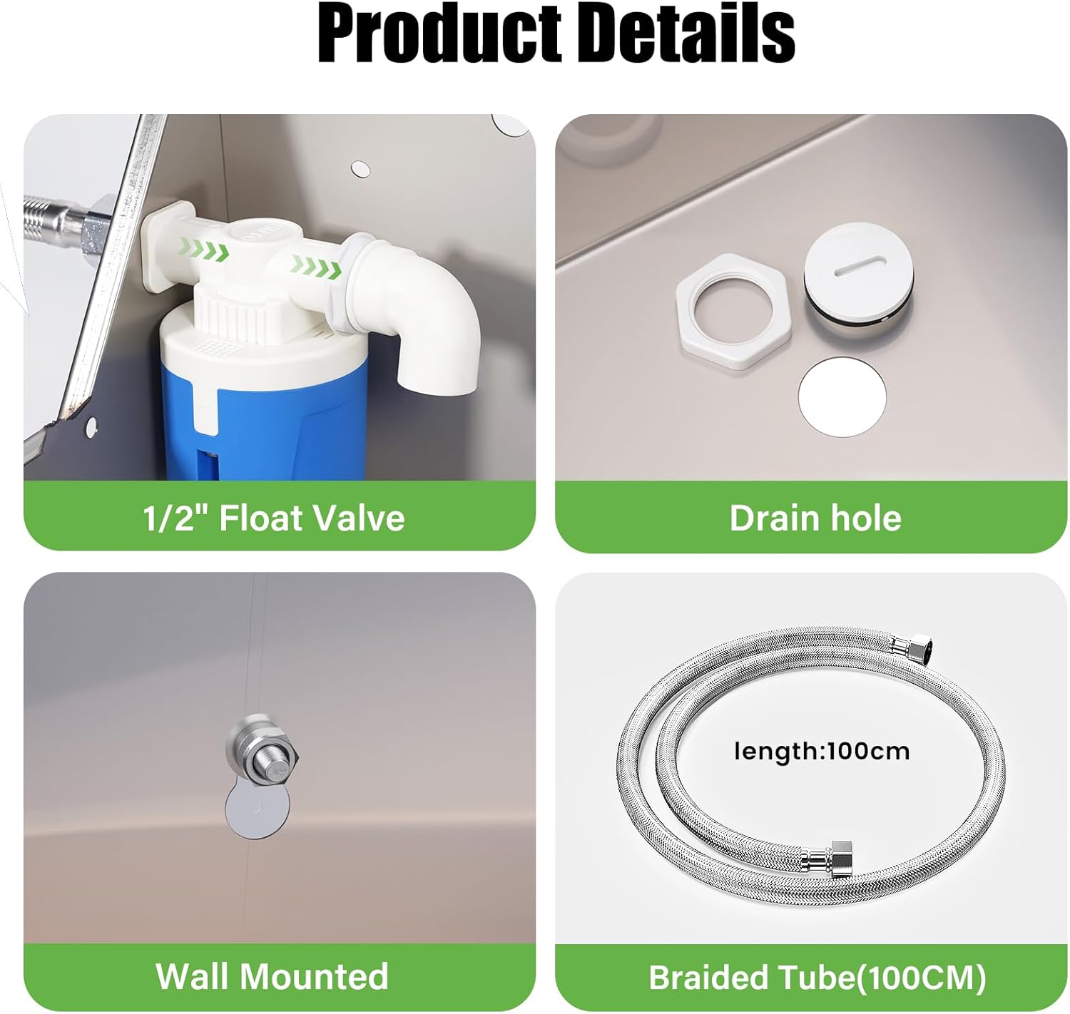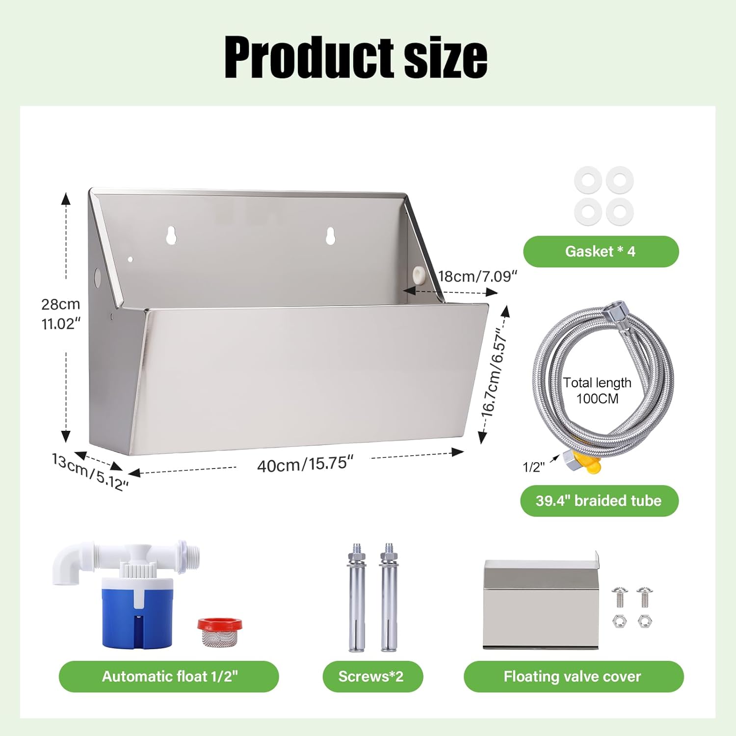 - 【Paketliste】: Dieser Edelstahlwasserspender ist mit 4 Dichtungen, einem 5-Meter (3/4 Zoll) geflochtenen Rohr, einem 1/2 Zoll automatischen Schwimmventil, 2 Expansionsschrauben und einer Schwimmventildeckel ausgestattet, die eine konstante, leckfreie