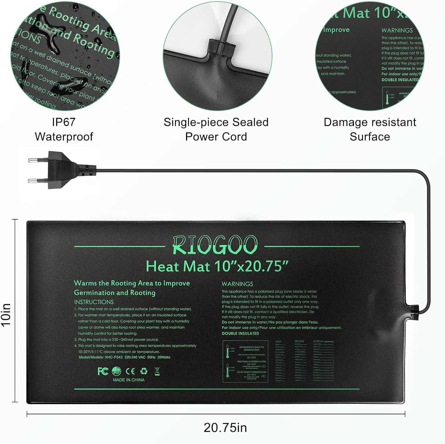 - Entspricht den MET-Standards: Die geschmeidige, flexible und extrem haltbare RIOGOO-Heizmatte für Sämlinge erfüllt die MET-Standards, Wasserbeständigkeit, die ein sicheres Schrubben ermöglicht.