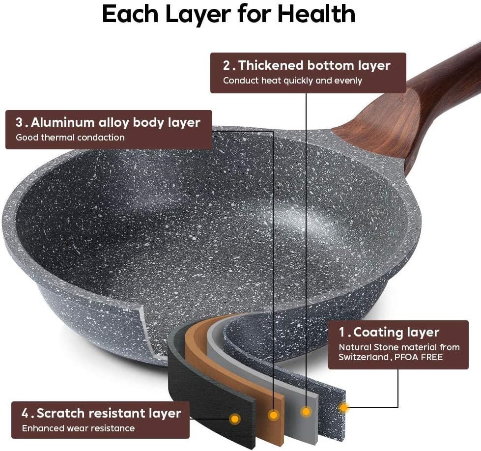 - 🍳【Natürliche Elemente】- Granitbeschichtung kombiniert mit Holzmaserung Griff. Wir sind bestrebt, diese Elemente zu verwenden, um die einfachsten Kochstile und die authentischsten Aromen von Lebensmitteln wiederherzustellen. Tipp: Griffe aus