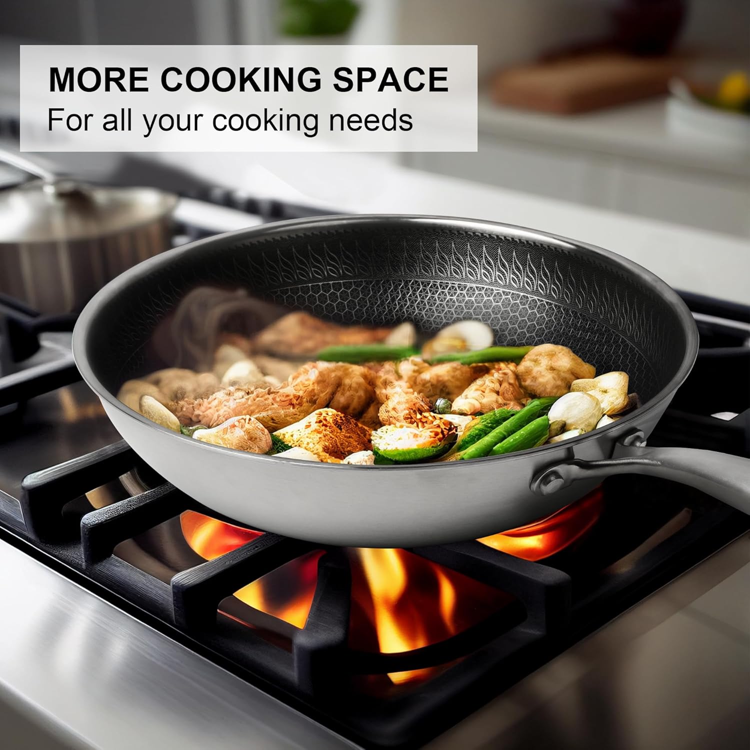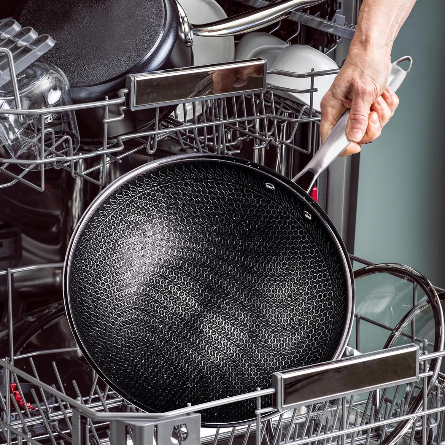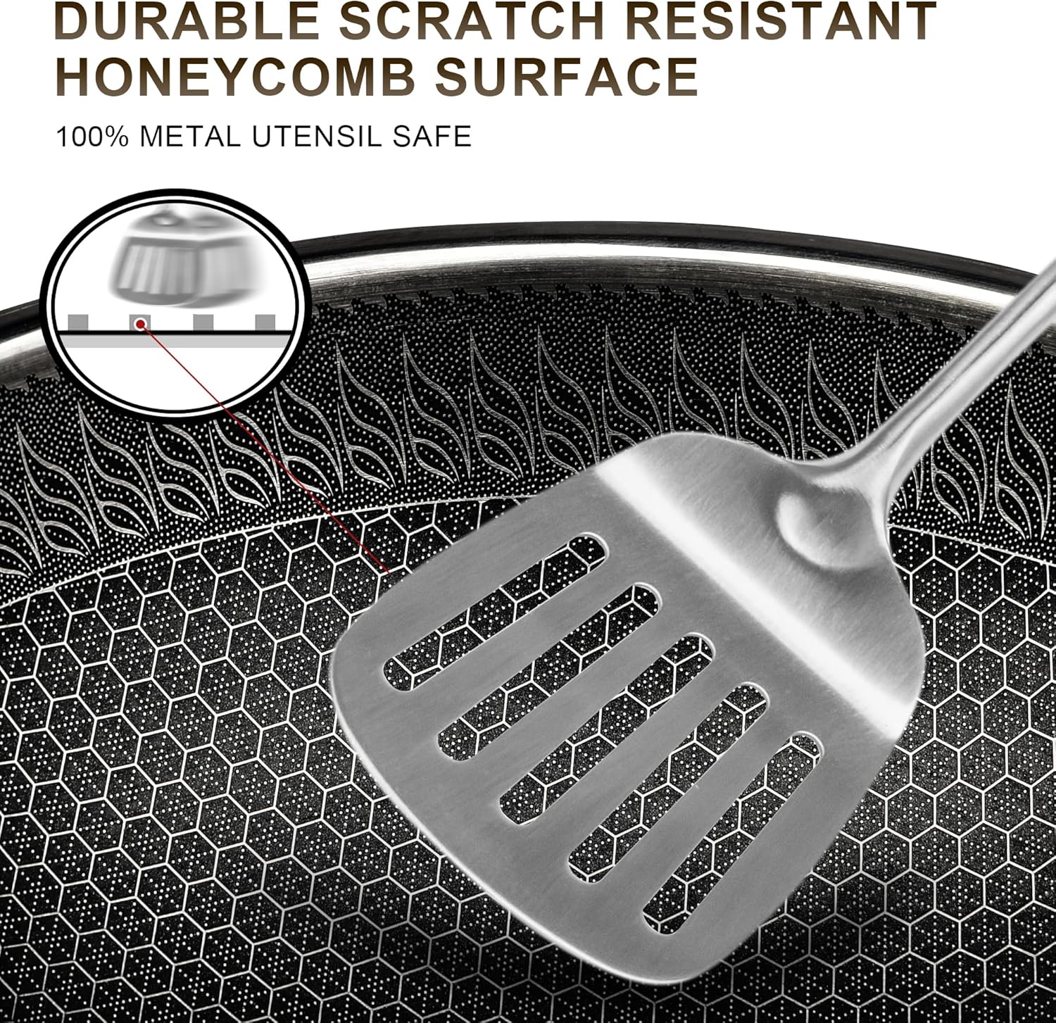 - đăWabenförmiges Musteră Das Wabenmuster aus Edelstahl bildet eine beeindruckende und dauerhafte kratzfeste OberflĂ€che, die Metallutensilien sicher ist und gleichzeitig die Entstehung von Ălrauch reduziert, was sich besonders fĂŒr den intensiven