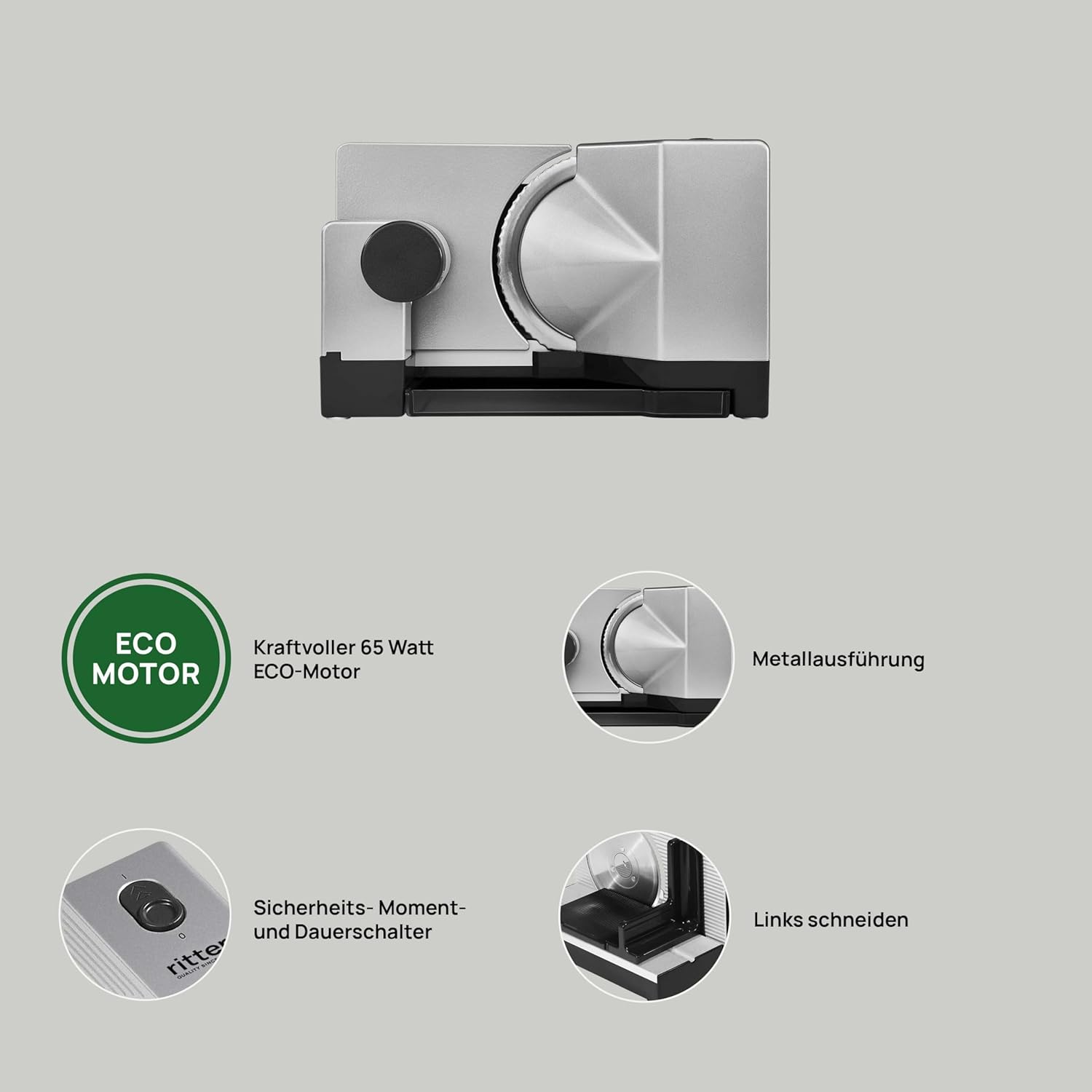 - Lieferumfang: Allesschneider silbermetallic mit Wellenschliffmesser, Schneidgut-Auffangschale, Schneidgutschlitten, Restehalter, Bedienungsanleitung