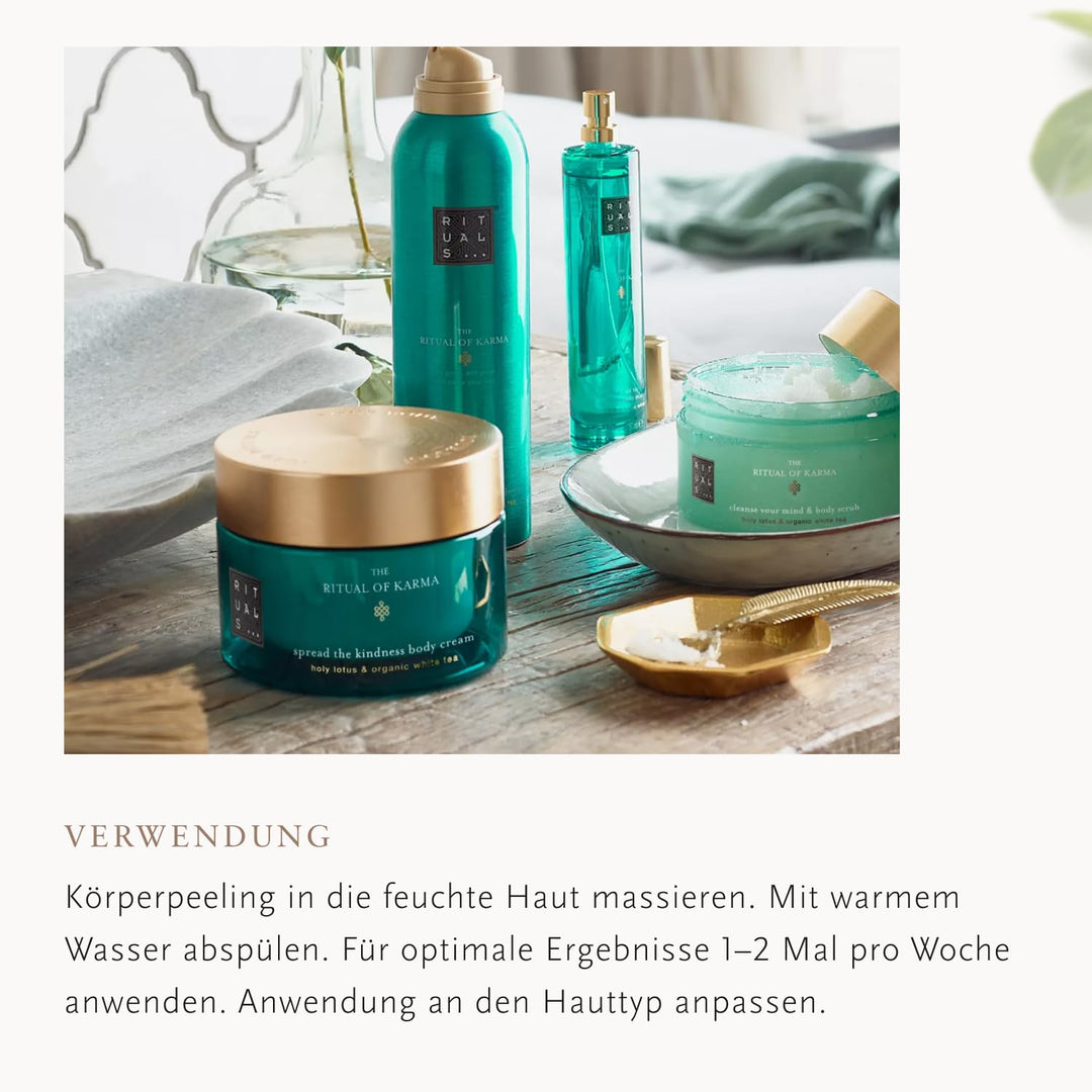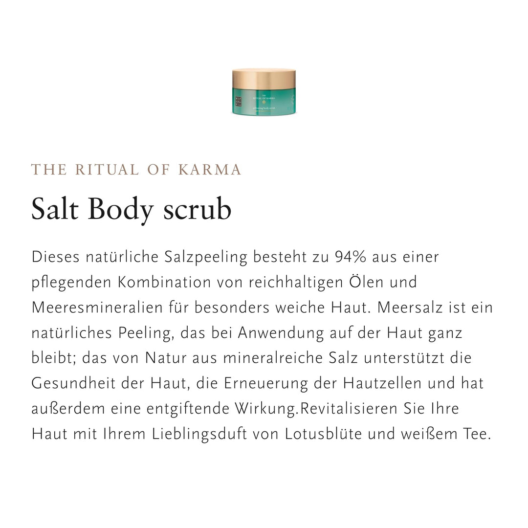 - The Ritual of Karma: Inspiriert von positiver Energie und Freundlichkeit, lädt dieses Salzpeeling dazu ein, das ganze Jahr das Gefühl von Sommer zu geniessen.