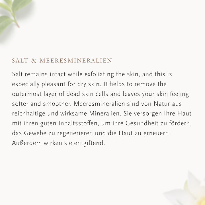 - Pflegende Inhaltsstoffe: Die Kombination aus reichhaltigen Ölen, Salz und Meeresmineralien in diesem Body Peeling entfernt abgestorbene Hautschüppchen und pflegt die Haut intensiv.