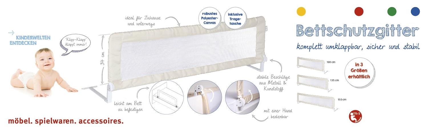 - AUS ROBUSTEN POLYESTER-CANVAS gefertigt. Die Masse des Bettgitters sind HxBxT: 51x40x150 cm. Altersspanne: von 1,5 bis 5 Jahre
