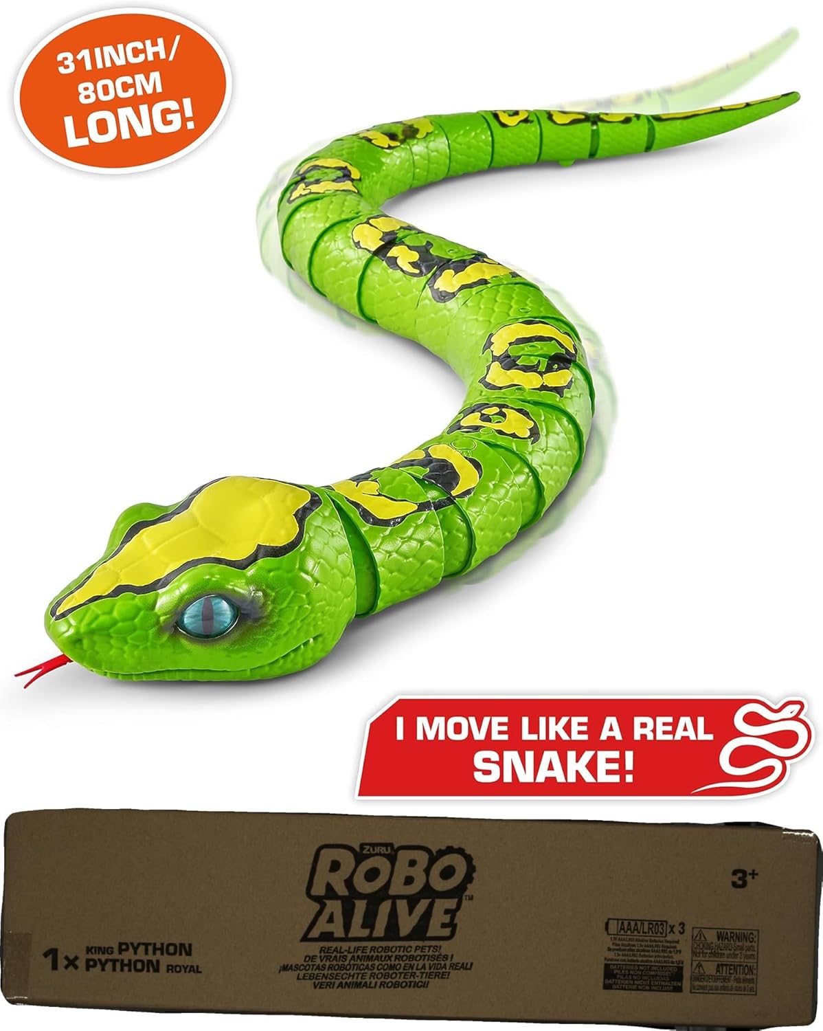 - Intelligente Bewegungstechnologie: Die intelligente Bewegungstechnologie von Robo Alive verleiht dieser König-Python-Zähne ratternden Realismus! Beobachten Sie, wie es über den Boden zu seiner Beute schlitten und Ihre Finger kreuzt, es ist nicht Sie!