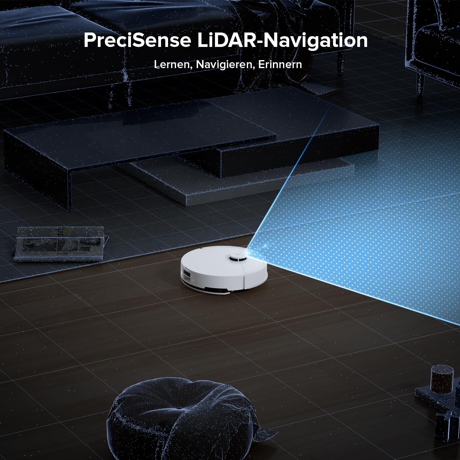 - PreciSense LiDAR Navigation: Das LiDAR-basierte Navigationssystem scannt 360° und erstellt gleichzeitig detaillierte Karten für die effizienteste Routennavigation. Es speichert auch mehrere Karten für mehrere Etagen.