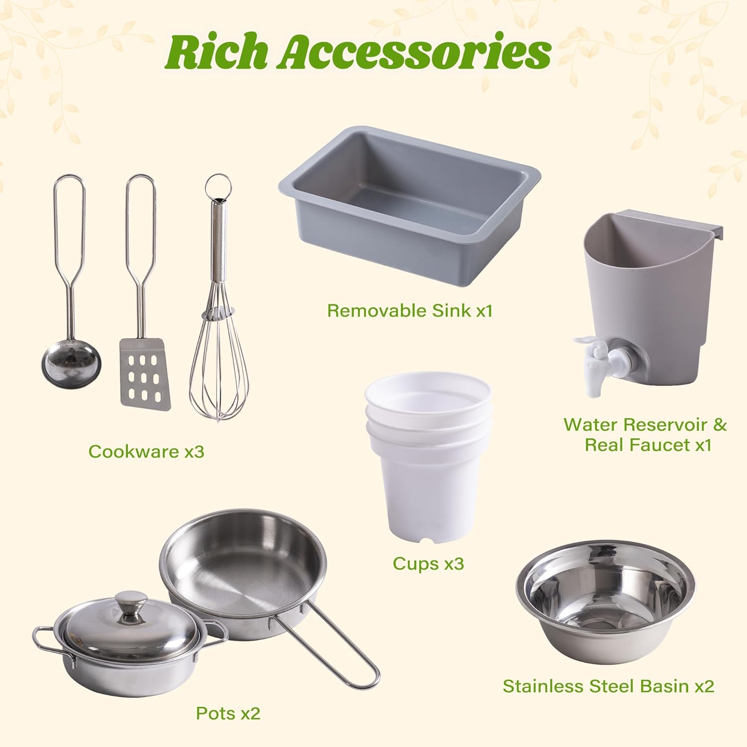 - Zubehör inklusive – Um das Spielerlebnis zu bereichern, liegt nützliches Zubehör bei. Haken ermöglichen das Aufhängen von Utensilien, der Küchenrollenhalter sorgt für realistischen Spielspass und der Obstkorb bietet Platz für Spielprodukte.