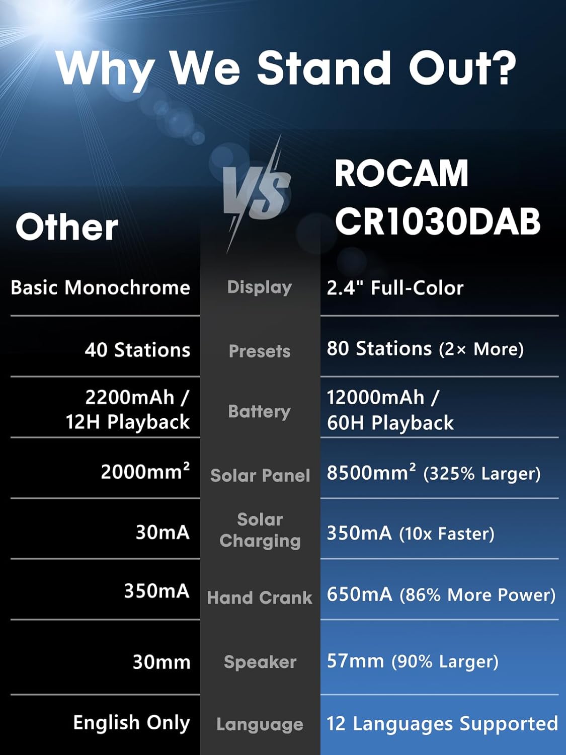 - 🎯Grosses Upgrade: Der ROCAM CR1030DAB Kurbelradio wurde umfassend verbessert – inklusive aktualisiertem DAB+-Chip, 2,4"-HD-Farbdisplay, Bluetooth-Funktion, verbessertem Klang und längerer Akkulaufzeit!