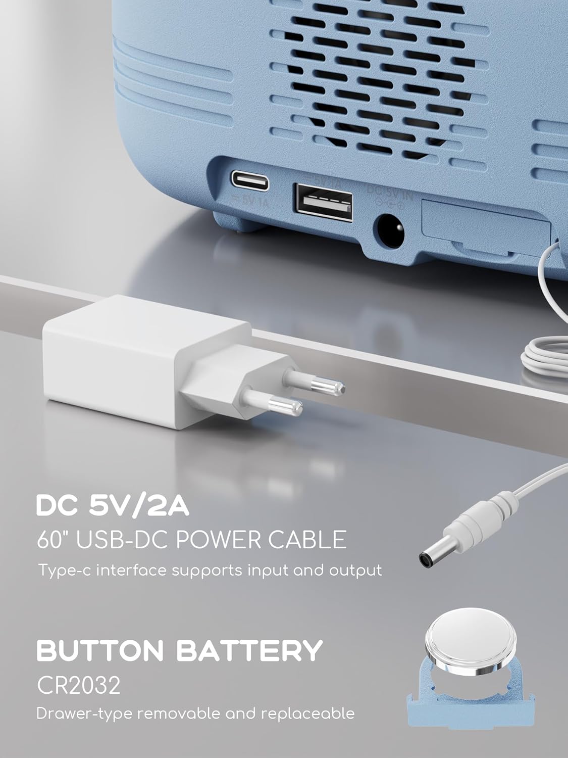 - [ Einstellungen für Ladeanschluss und Batterie Sicherung ] Im Lieferumfang enthalten sind ein Radiowecker, ein USB-Netzteil mit Stromkabel. Stecken Sie die Uhr in die Steckdose und los geht's. Es kann auch über Typ-C und USB A mit Strom versorgt