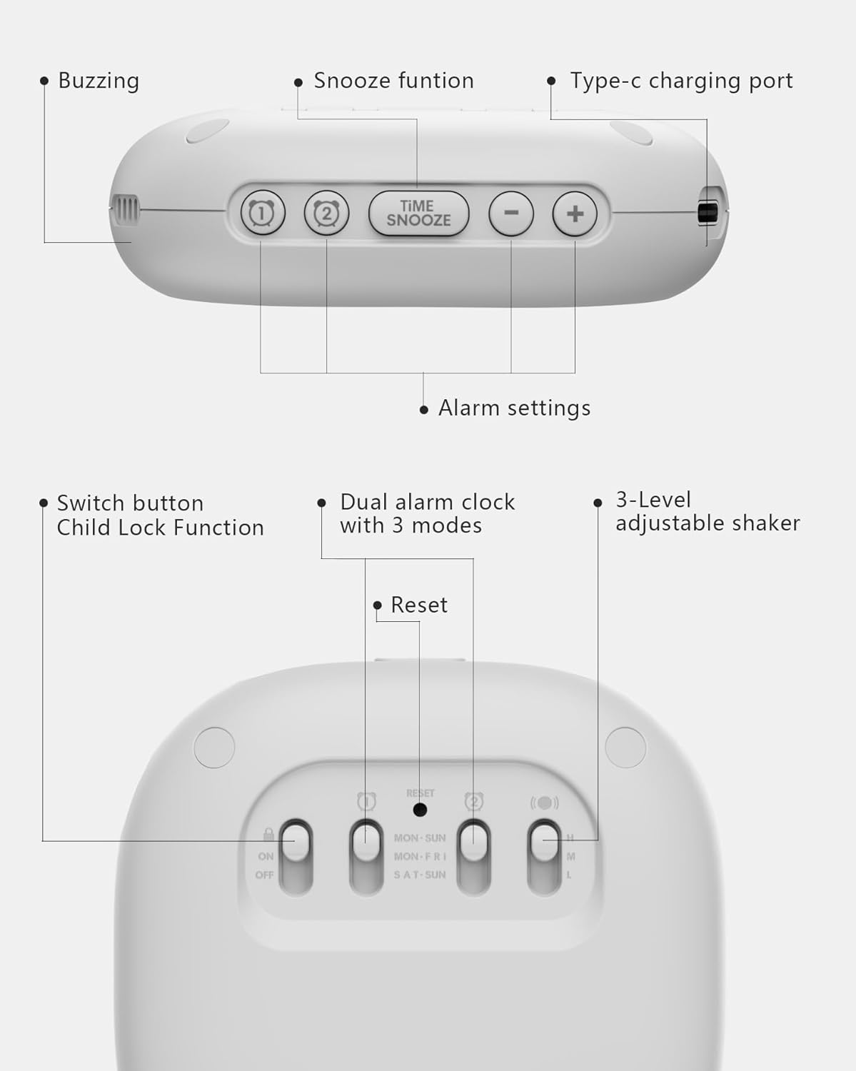 • [Einstellbare Vibrationsstufen]: Personalisieren Sie Ihr Aufwachen mit drei einstellbaren Vibrationsstufen - niedrig, mittel und hoch. Passen Sie die Intensität an Ihre Vorlieben an und beginnen Sie den Tag sanft oder belebend.